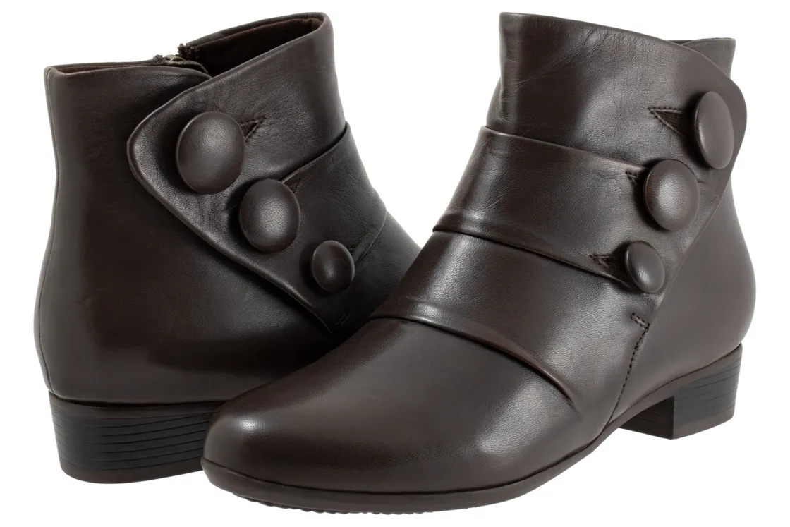 The Mila boot has a folded leather wrapped across the front secured with three large tonal buttons giving it a distinctive style you’ll love. An inside zipper allows easy on/off and the interior is lined in soft comfortable material