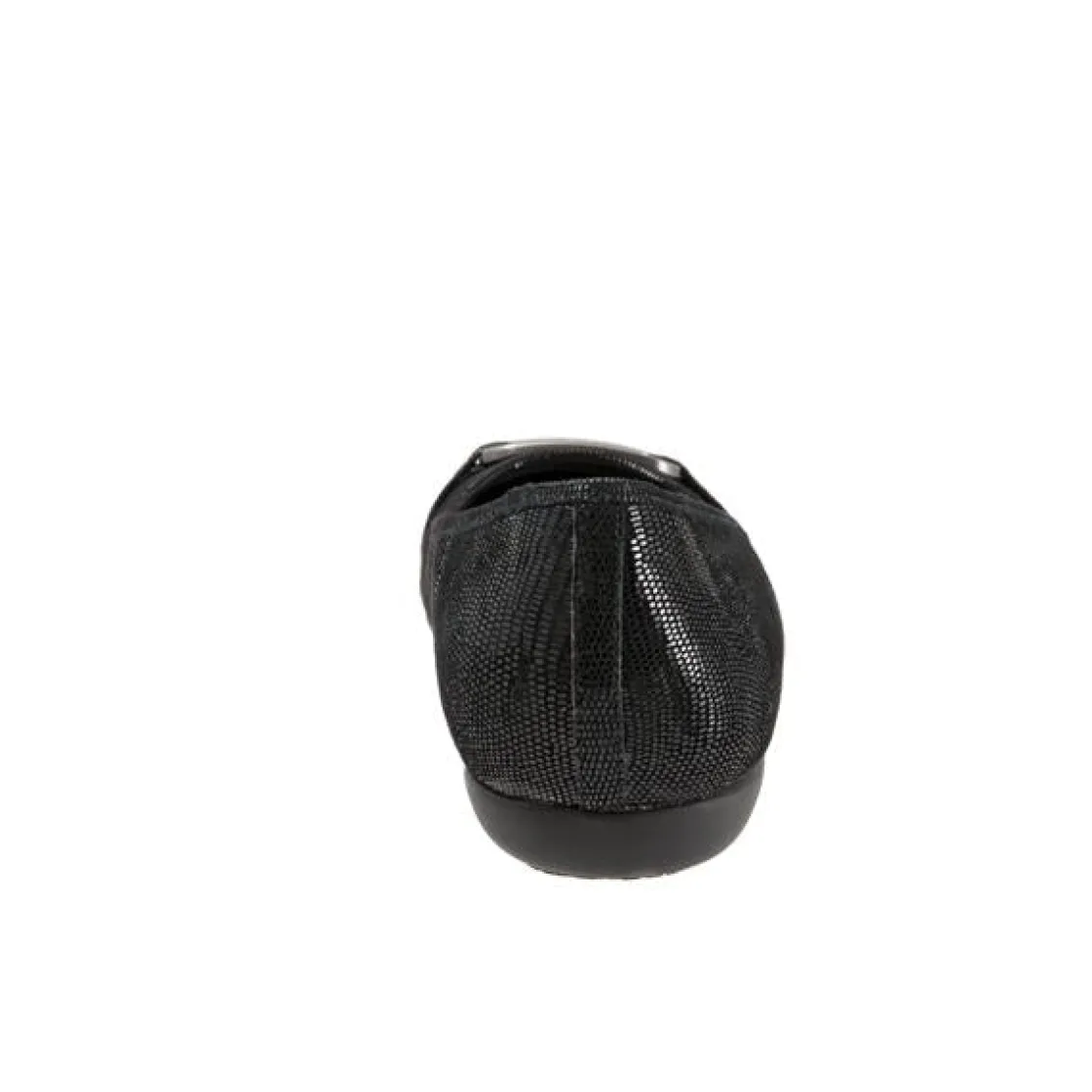 The ballerina flat, Sizzle, is dressed up with classy metal ornament buckle detail covering the toe. A great everyday walking tailored flat for work or play. Suede Metallic colors have a man-made microfiber suede upper with painted metal buckle detail on toe.
