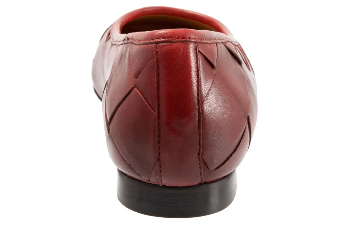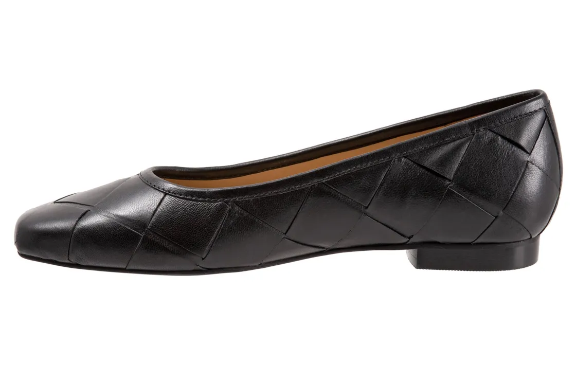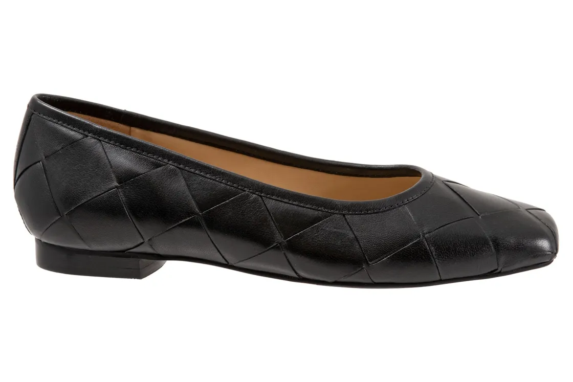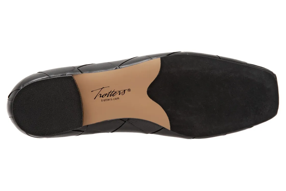 Trotters Hanny is a sleek and comfy ballet flat. Prominent features include oversized woven leather uppers, removable molded EVA footbed and rubber outsole. These flat shoes also have a square toe, odor-resistant sueded microfiber lining and low, ⅝ inch heel height.