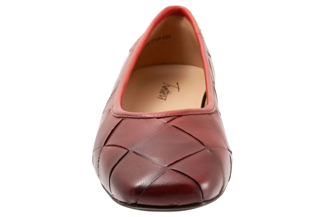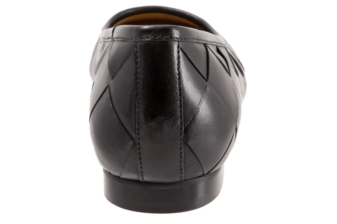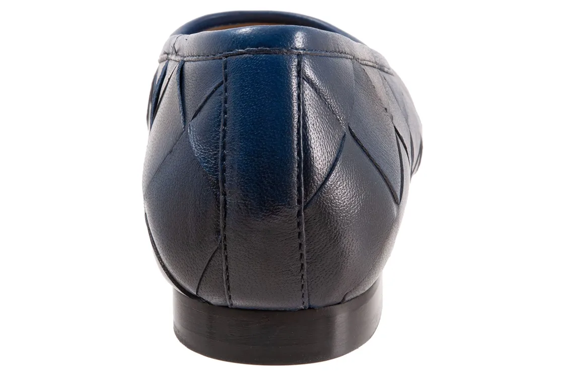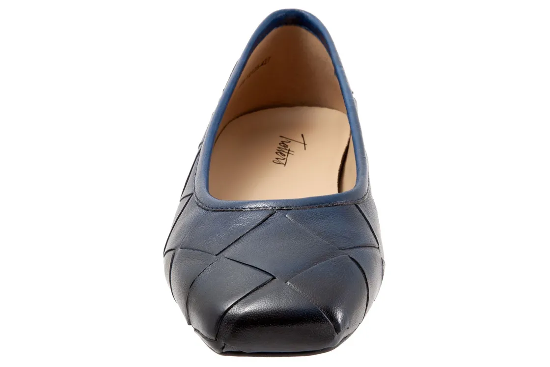 Trotters Hanny is a sleek and comfy ballet flat. Prominent features include oversized woven leather uppers, removable molded EVA footbed and rubber outsole. These flat shoes also have a square toe, odor-resistant sueded microfiber lining and low, ⅝ inch heel height.