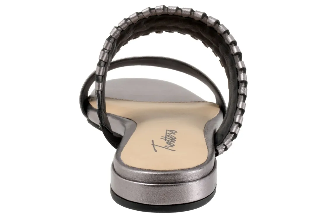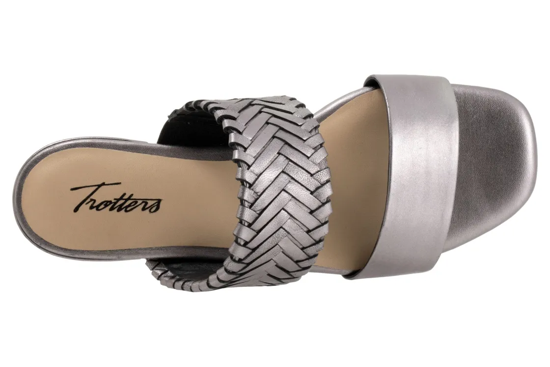 The Trotters Nalane sandal combines a smooth leather strap with a woven leather strap for a fun look. The woven strap has elastic goring on the instep and the lining is all leather for a super-comfortable sandal flat.