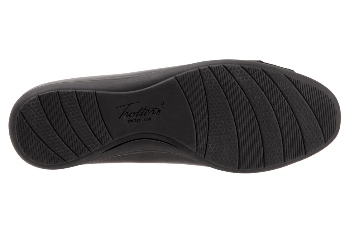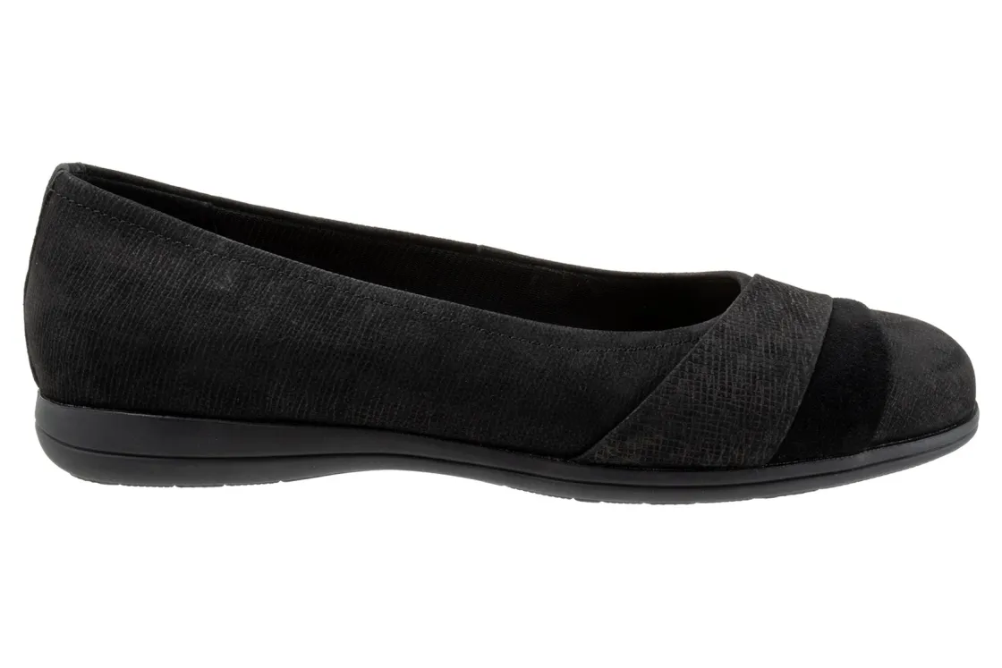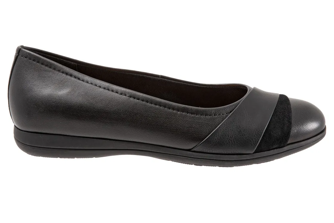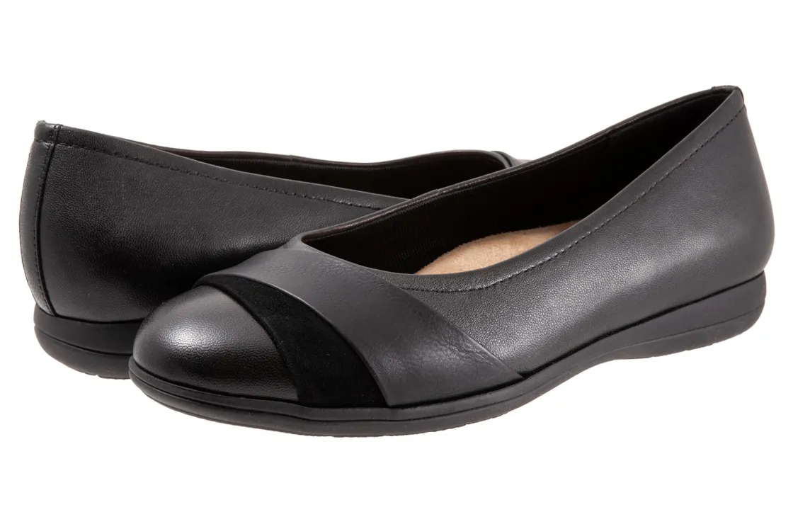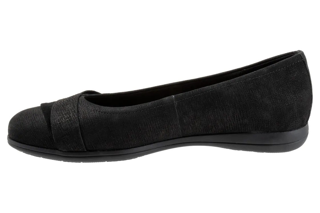Danni is an essential flat with mixed materials and asymmetric detailing. A grippy rubber sole and removable cushioned footbed with arch support make for all day comfort.