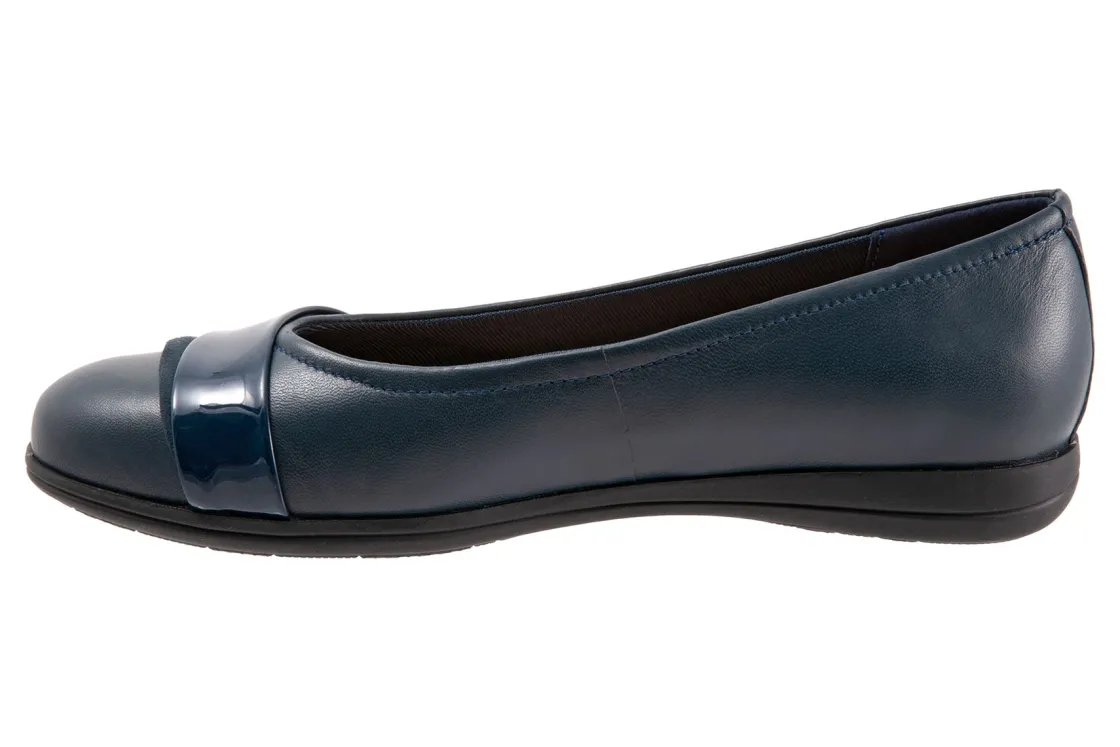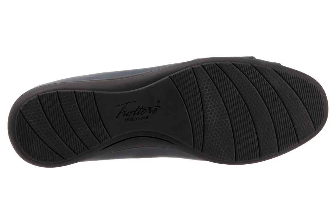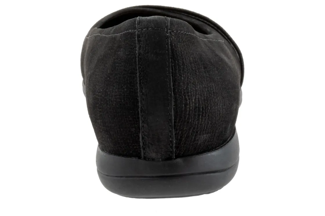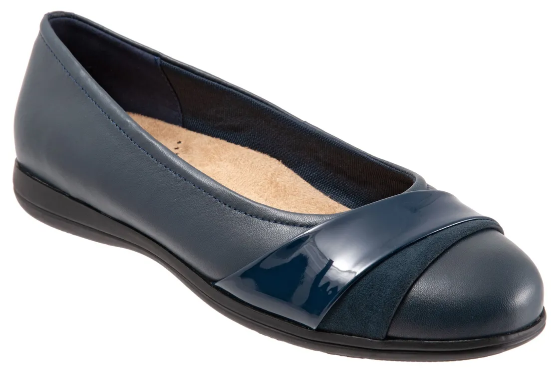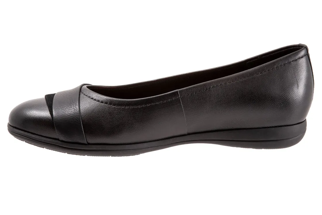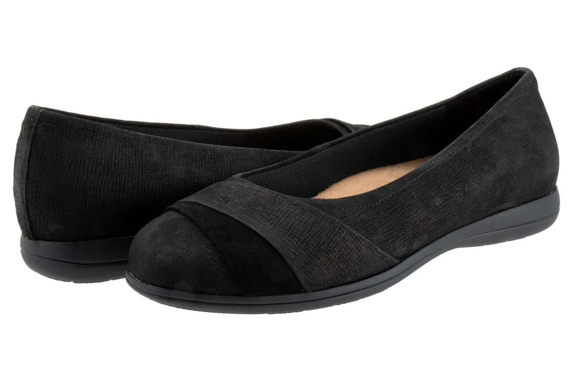 Danni is an essential flat with mixed materials and asymmetric detailing. A grippy rubber sole and removable cushioned footbed with arch support make for all day comfort.