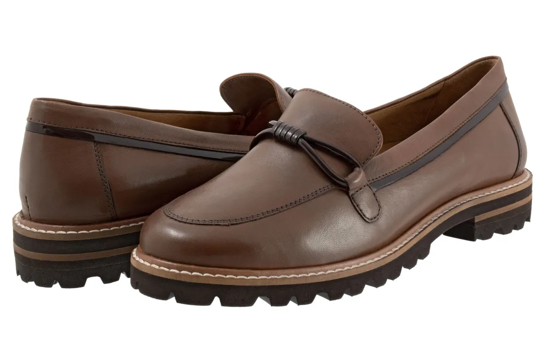 The Trotters Fiora loafer features contrasting details including a decorative strap and stitched welt. The rugged sole is light and flexible and the footbed is cushioned and removable.