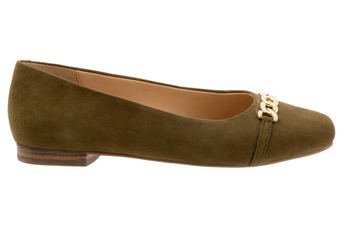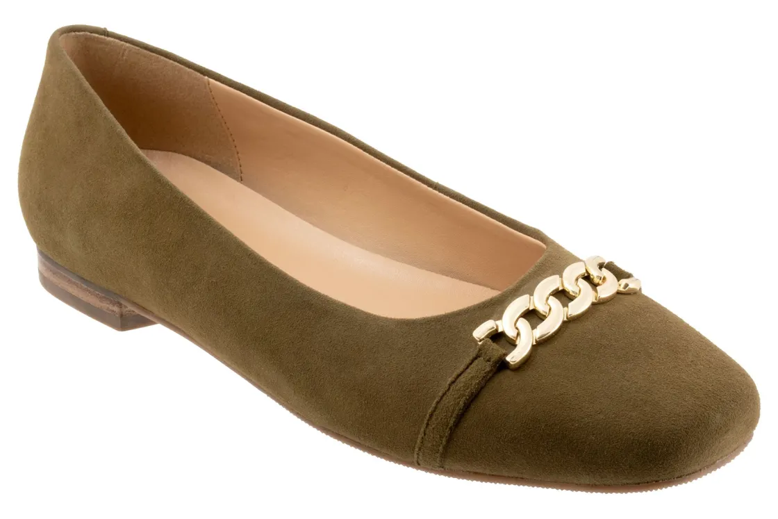 Trotters Harmony is a square-toe flat for any special occasion. These flat shoes have leather uppers, cushioned PU footbeds and lightweight rubberized outsoles. A soft Nappa upper lining, metal chain detailing and a ⅝ inch heel height makes these ballet flats irresistible.