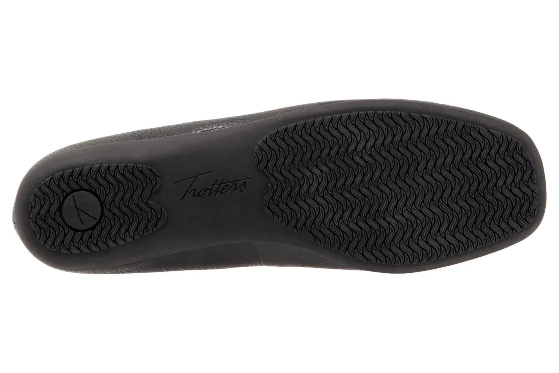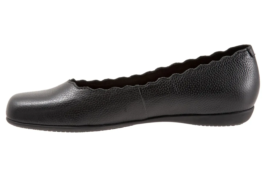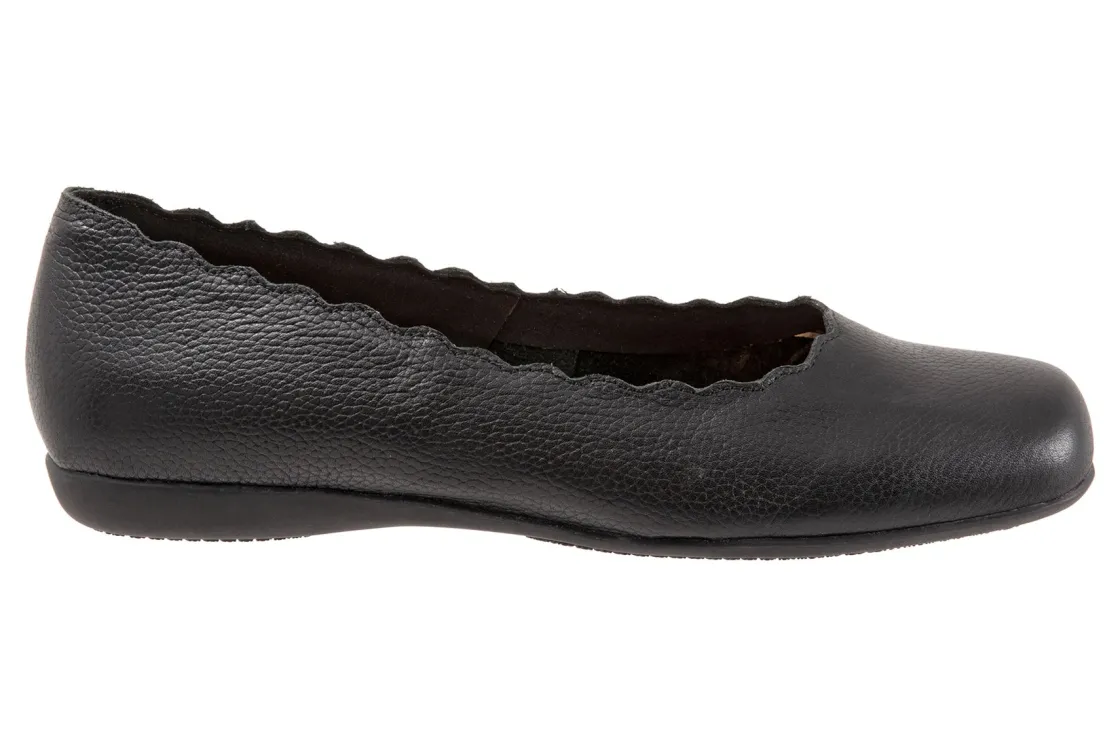Trotters Sabine is a stylish ballet flat with comfort features. These flat shoes have leather uppers, removable cushioned footbeds and molded rubber outsoles. A soft microfiber lining, scalloped edge construction and ⅝ inch heel height outlines these reliable flats.