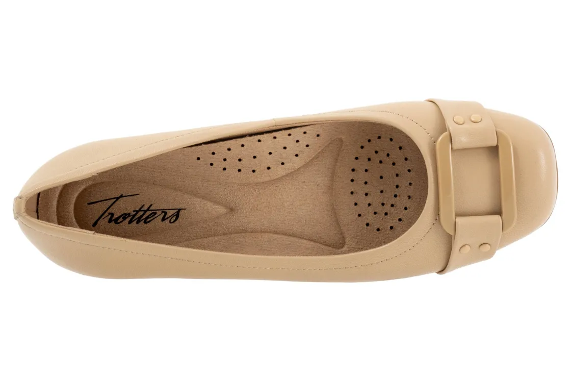 The ballerina flat, Sizzle, is dressed up with classy metal ornament buckle detail covering the toe. A great everyday walking tailored flat for work or play. Suede Metallic colors have a man-made microfiber suede upper with painted metal buckle detail on the toe.