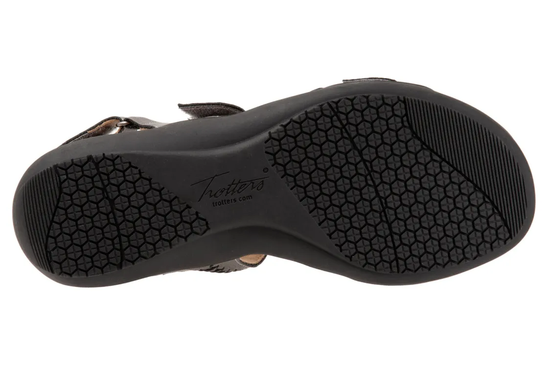 Trotters Romi Woven is a casual sandal built for comfort and support. Features include a braided leather upper, 3 adjustable hook and loop straps and memory foam EVA footbed. Also included are a soft velvet upper lining and durable rubber outsole for daytime walks and nightlife activities.