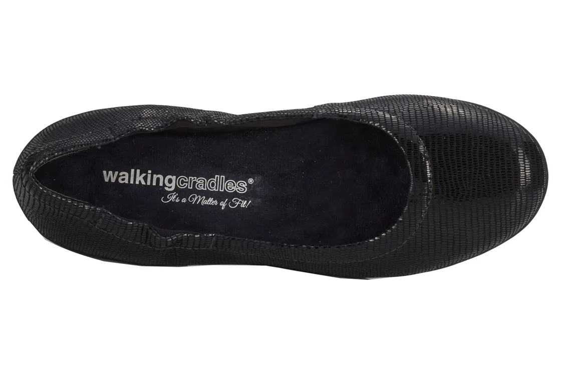 Walking Cradles Tess is a cushioned and roomy dress flat. These shoes have a soft leather upper, elasticized topline and removable dual-density foam insole. A roomy toe box, stacked block heel and slip on style creates a well-rounded and comfortable dress shoe.