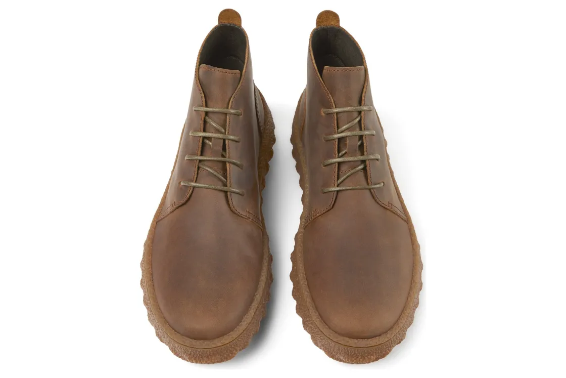 Lace up ankle boot for men. Waxed nubuck upper and Michelin rubber outsole.Ground reimagines urban street style by adding a contemporary twist on the industrial Camper aesthetic. The chunky outsole made with a mix of standard and natural rubber provides superior grip thanks to MICHELIN technology. Different, distinctive materials used for the sole and the upper, 360° stitching, premium leathers certified by the Leather Working Group enhance its silhouette and elevate this style for winter.