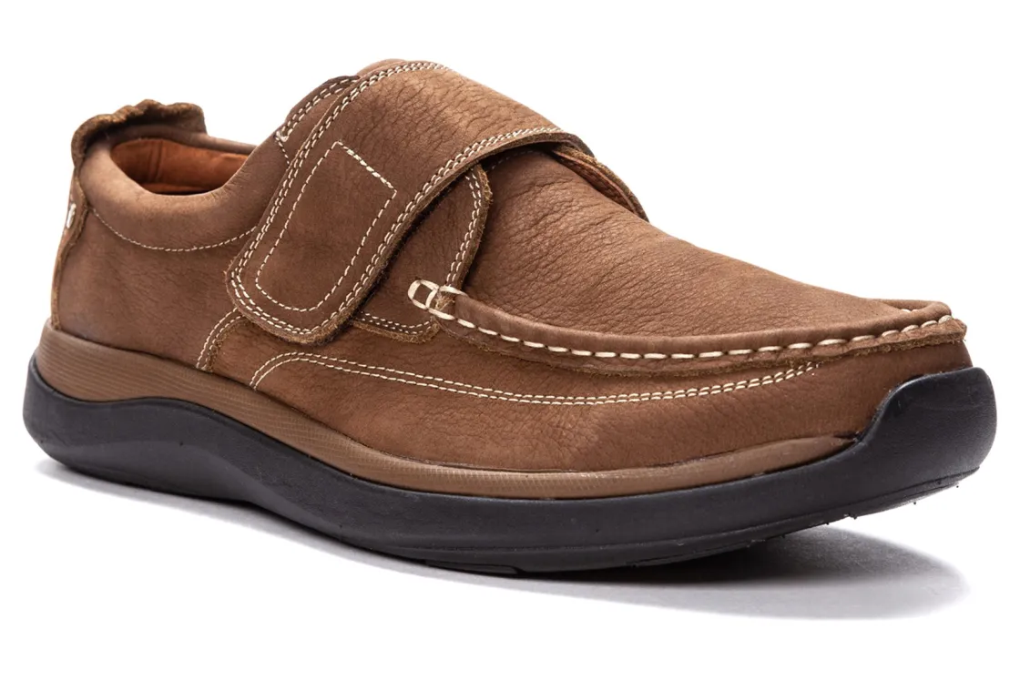 Propet Porter is a sturdy shoe with traditional moc styling. Features include a nubuck upper, mesh lining, removable footbed, open cell insole and EVA outsole. A hook and loop strap closure secures feet and a 1-inch platform heel elevates these stylish loafers.