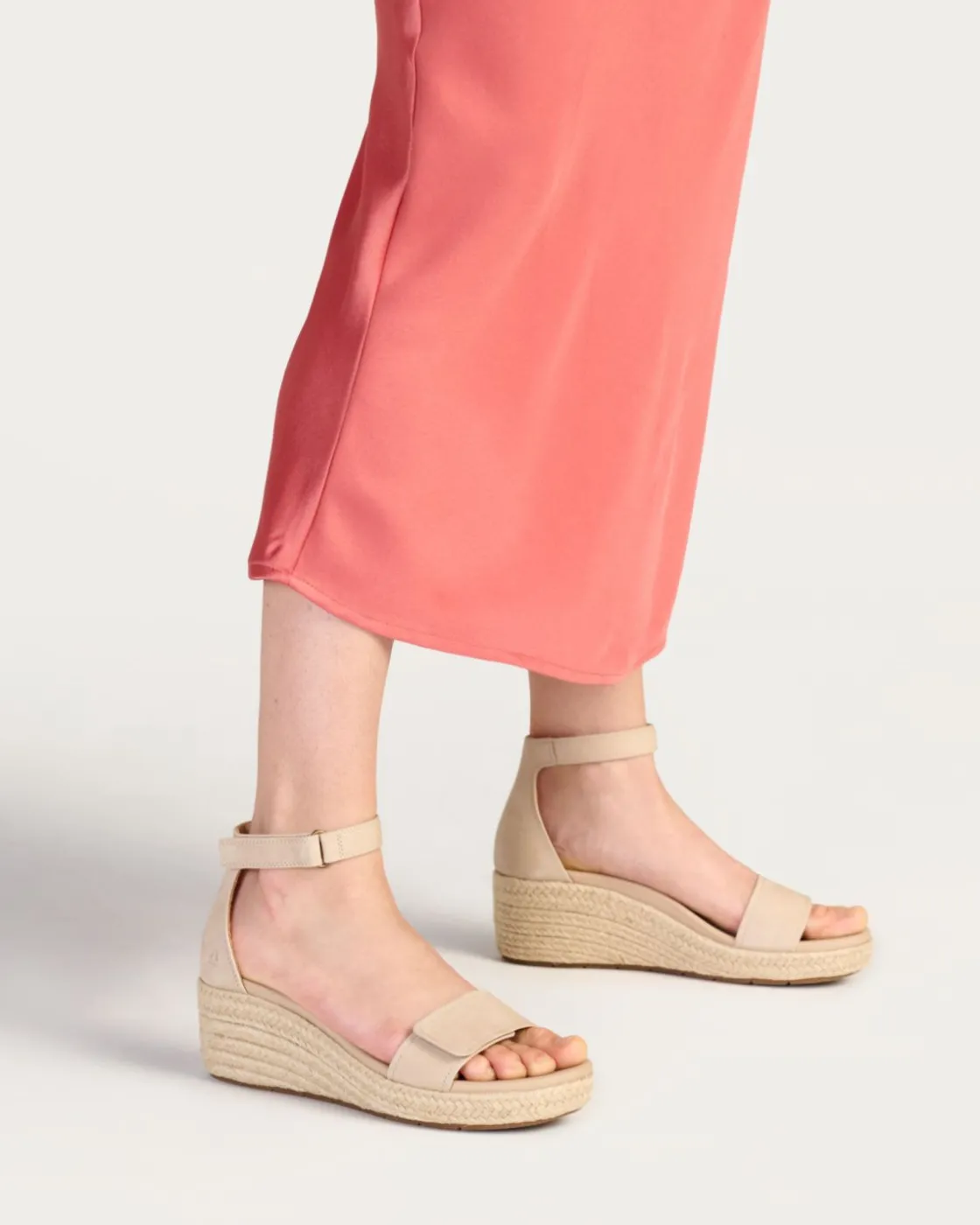 The ABEO Riviera Ankle Sandal provides arch support, natural cushioning, and an eco-friendly aesthetic appeal. Sporting the appearance of a clever flatform sandal that combines the height of a platform sandal with a flatter built-in orthotics, it promotes proper foot alignment and helps reduce pain and fatigue while walking. This wedge sandal was formerly called Cecile.