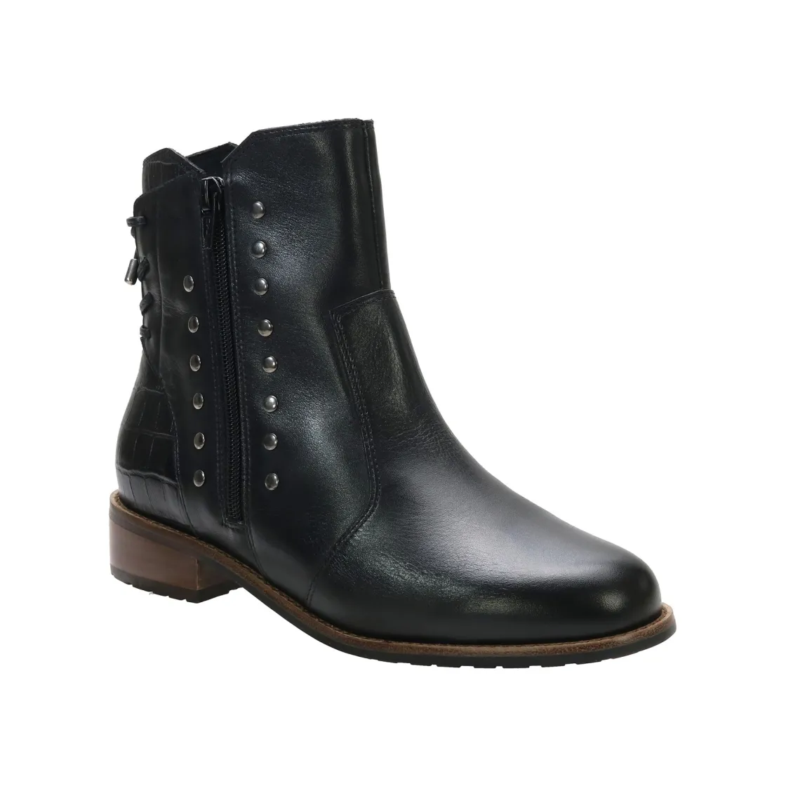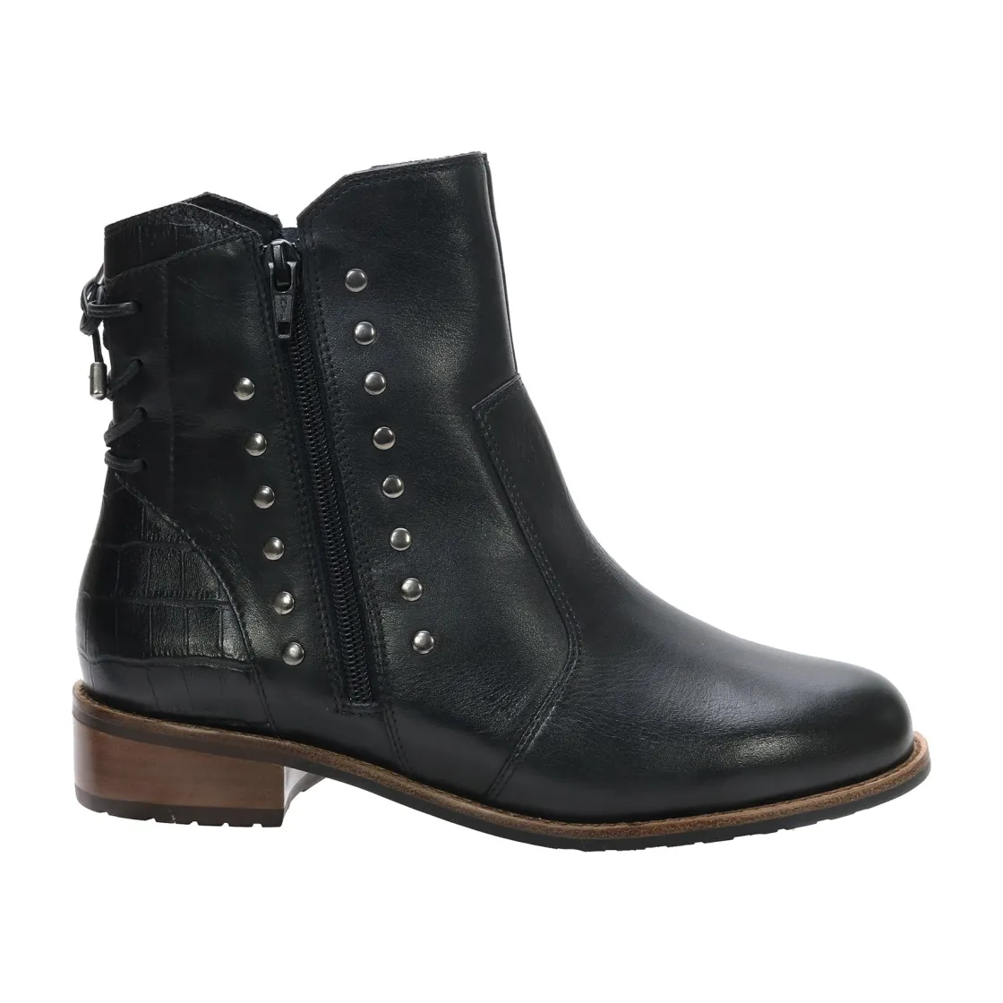 The meticulously crafted David Tate® Maestro boot features a waterproof soft calf leather upper that ensures dry and comfortable feet in any weather. It comes with a removable contoured rubber insole that guarantees exceptional comfort throughout the day. The boot is adorned with stylish metal nail head studs, leather laces at the back, and leather croc trim, enhancing its fashionable appearance while providing sturdy support for every step.