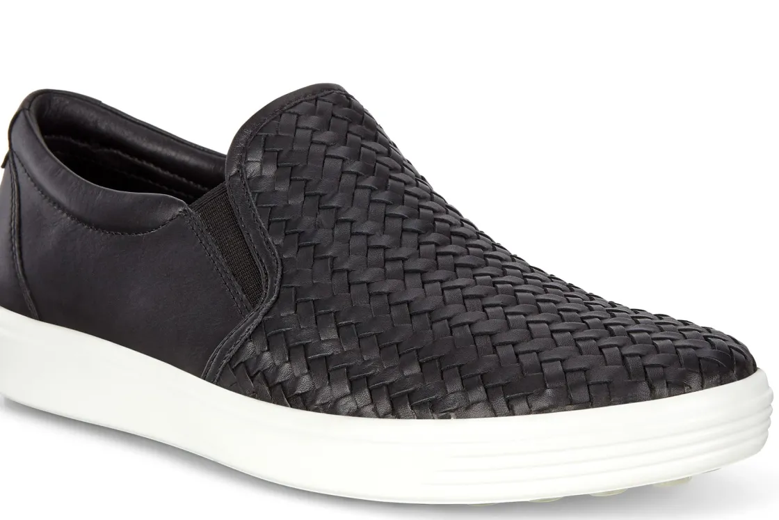 Ecco Soft 7 Woven is a timeless and comfy slip-on sneaker. Features include a top-grain leather upper, a removable cushioned footbed and a synthetic outsole. Elastic gore panels, a breathable textile lining and a closed round toe outlines these versatile sneakers.