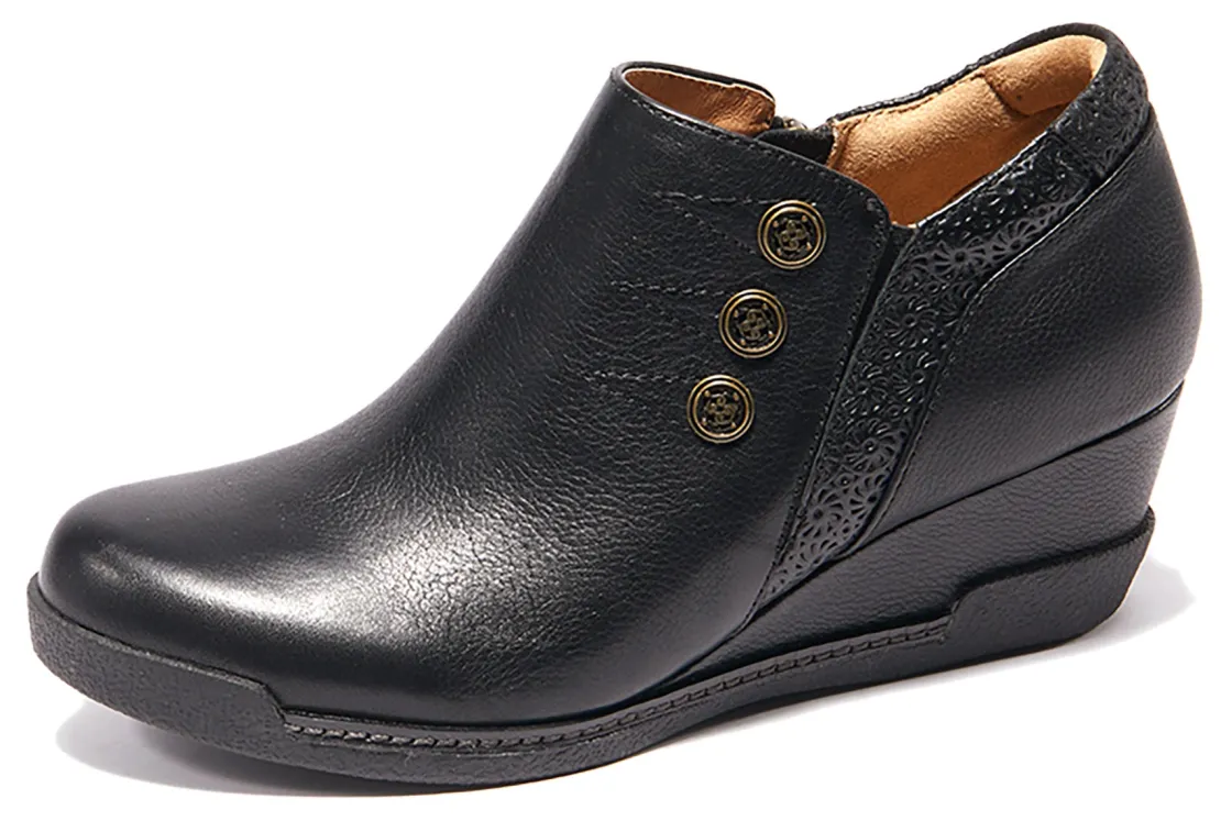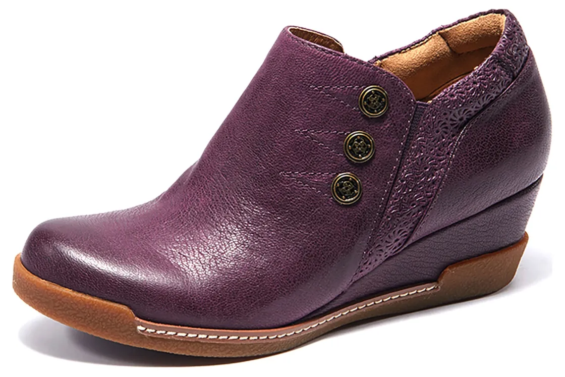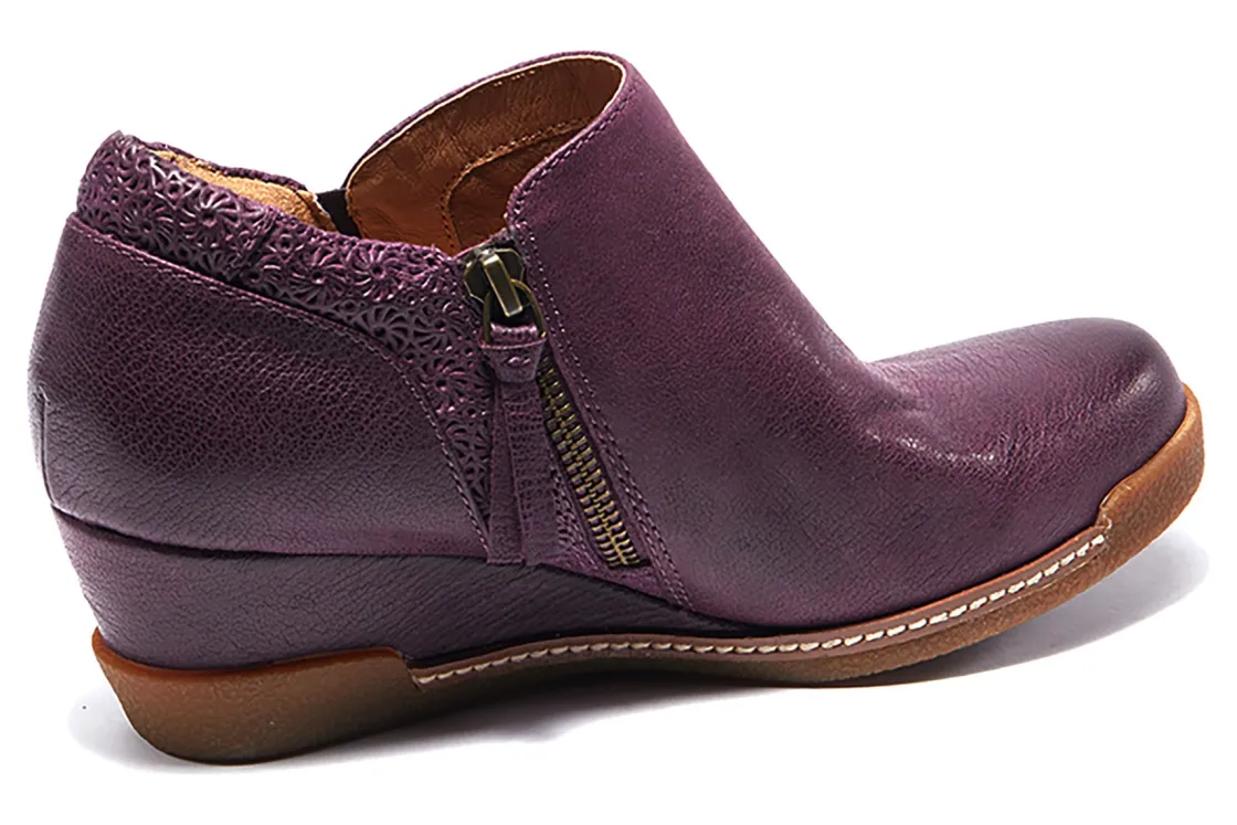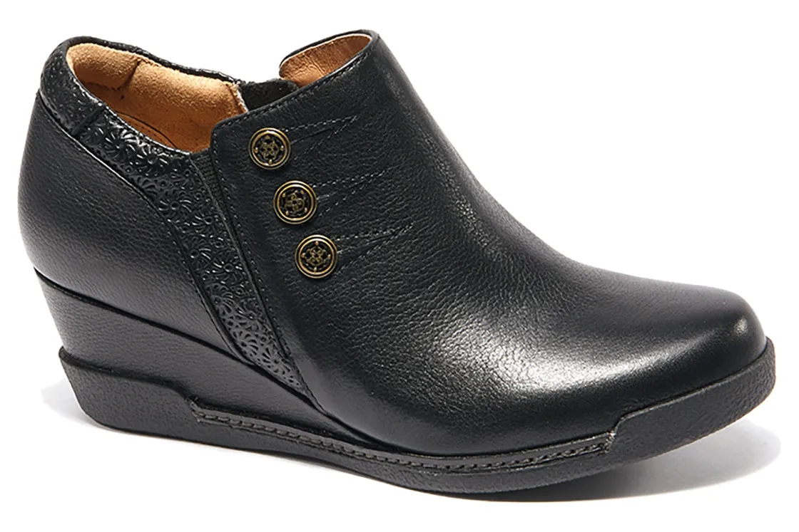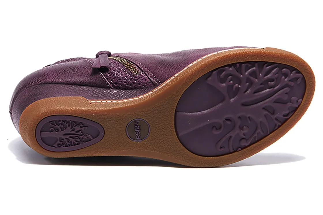 Halsa Footwear Devina is a trendy and comfortable women’s boot. These wedge booties have leather uppers, removable insole, 2-inch wedge heel and rubber outsole. A padded heel counter, zippered side closure with elasticized goring and shock-absorbing midsole makes these boots a wardrobe staple.