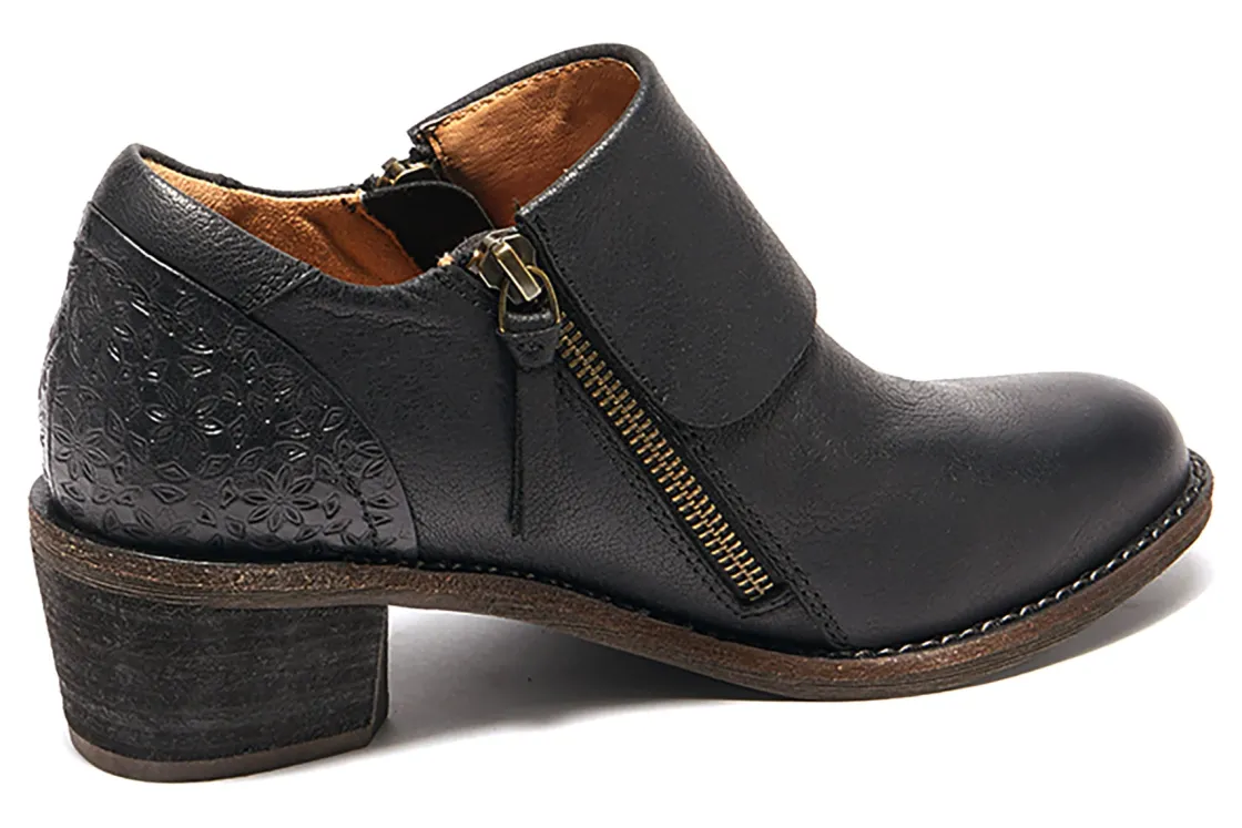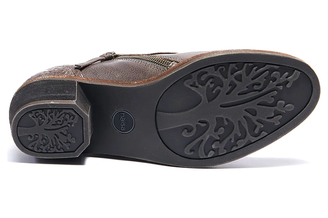 Halsa Footwear Michelle is a fashionable women’s boot. Features include a leather upper with metallic studs, zippered side closure and flexible rubber outsole. A closed almond toe, block heel and removable cushioned insole outlines these chic ankle boots.