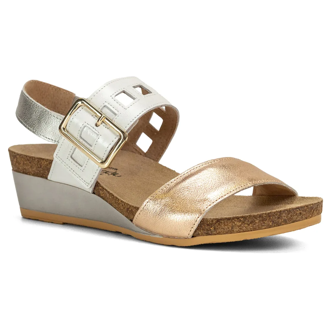 Go day to night with all day comfort and style in the Naot Dynasty wedge. This sandal features fun multi colored straps and a hook and loop closure for adjustability. Naot’s anatomic cork & latex footbed is wrapped in a pampering suede and molds to the shape of the foot with wear.