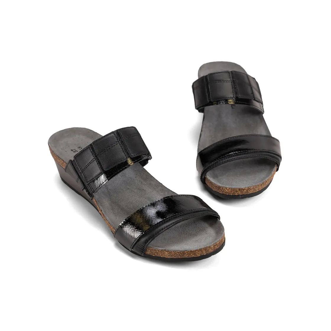 Naot Royalty is a dressy slide with a sleek design. An anatomic cork and latex footbed is wrapped in suede and molds to the shape of the foot with wear. A sturdy PU outsole and stretchable instep strap completes this fashionable silhouette.