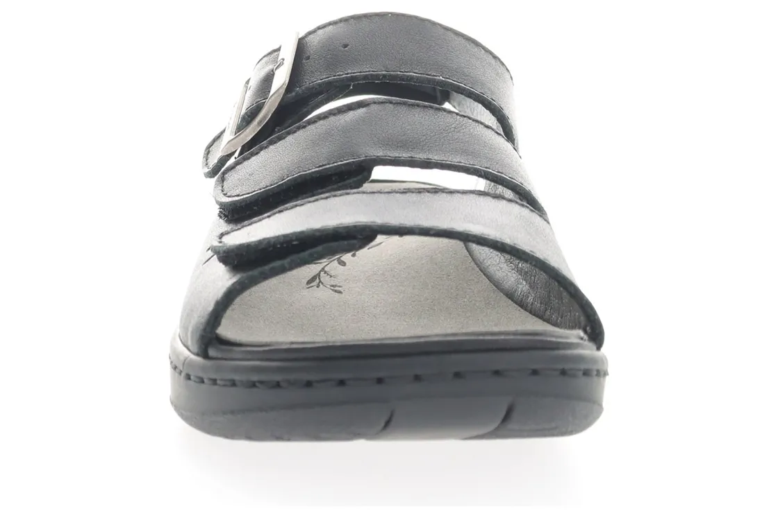 Supple, full-grain leather with three adjustable straps with hook and loop and one buckle, plus comfort slingback strap.