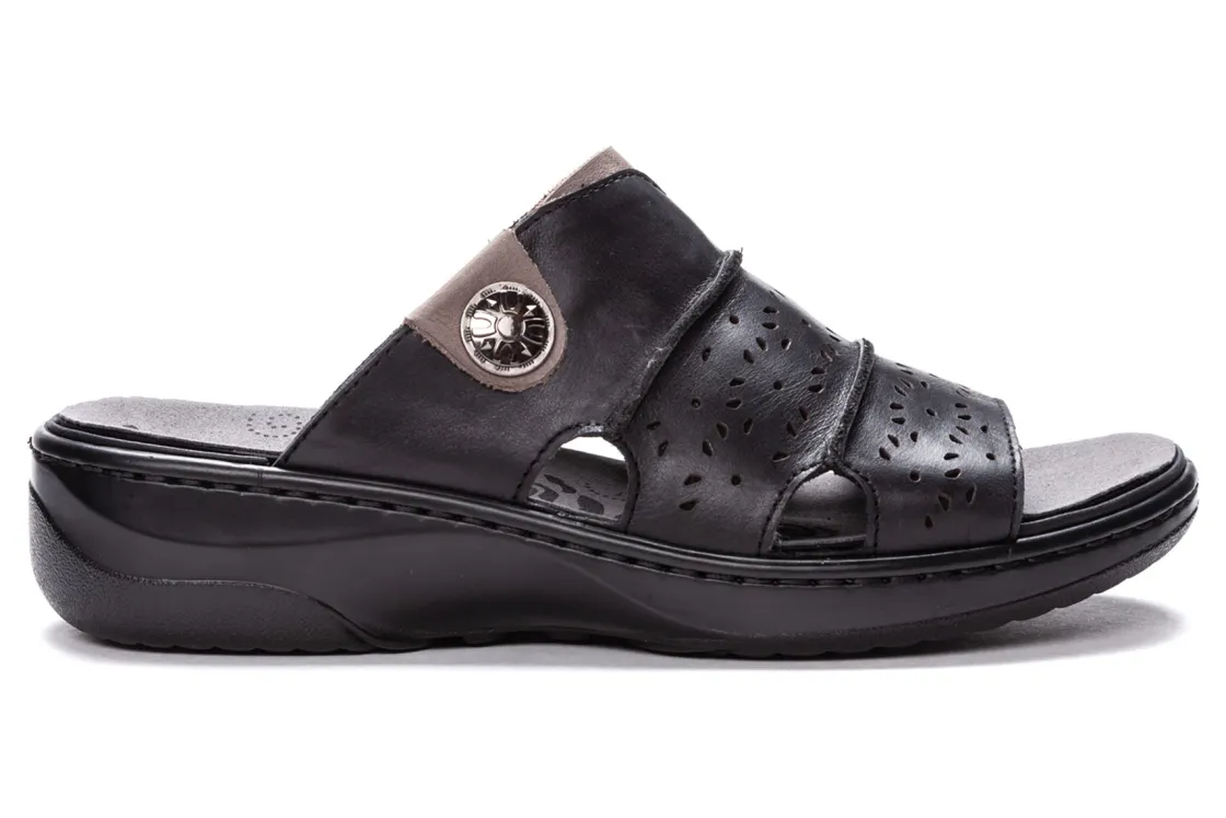 Slide right into comfort with the Gertie and its supple leather upper plus a removable footbed for custom orthotics. Slide sandal with laser cut detailing and medallion embellishment.