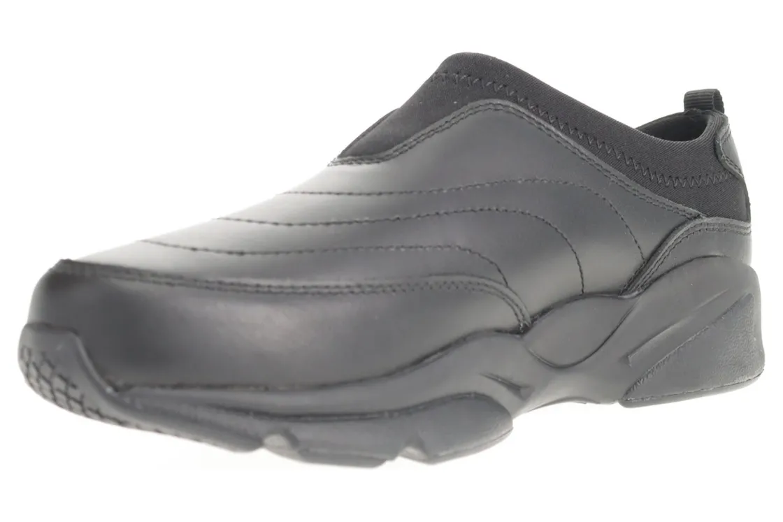 Leather or Nubuck slip-on with center gore and a roomy toe box providing toes space to spread out improving stability. Soft cushioning PU for even wear with comfort ridges in the forefoot and memory foam topper. Supportive EVA midsole with rubber outsole for a long-lasting smooth stride. Slip Resistant, Scotchgard™ stain and water resistant treatment.