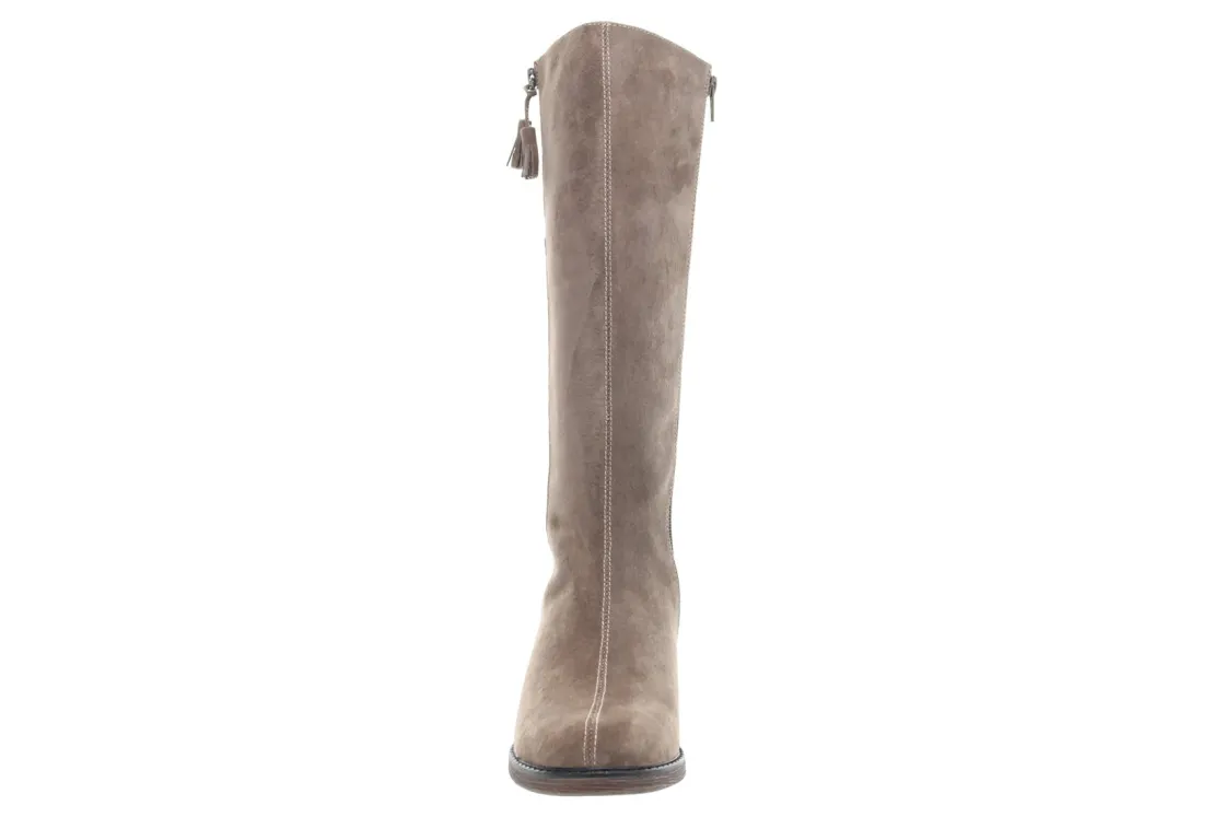 Tall shaft suede boot with inside zip and hidden goring plus decorative tassel.