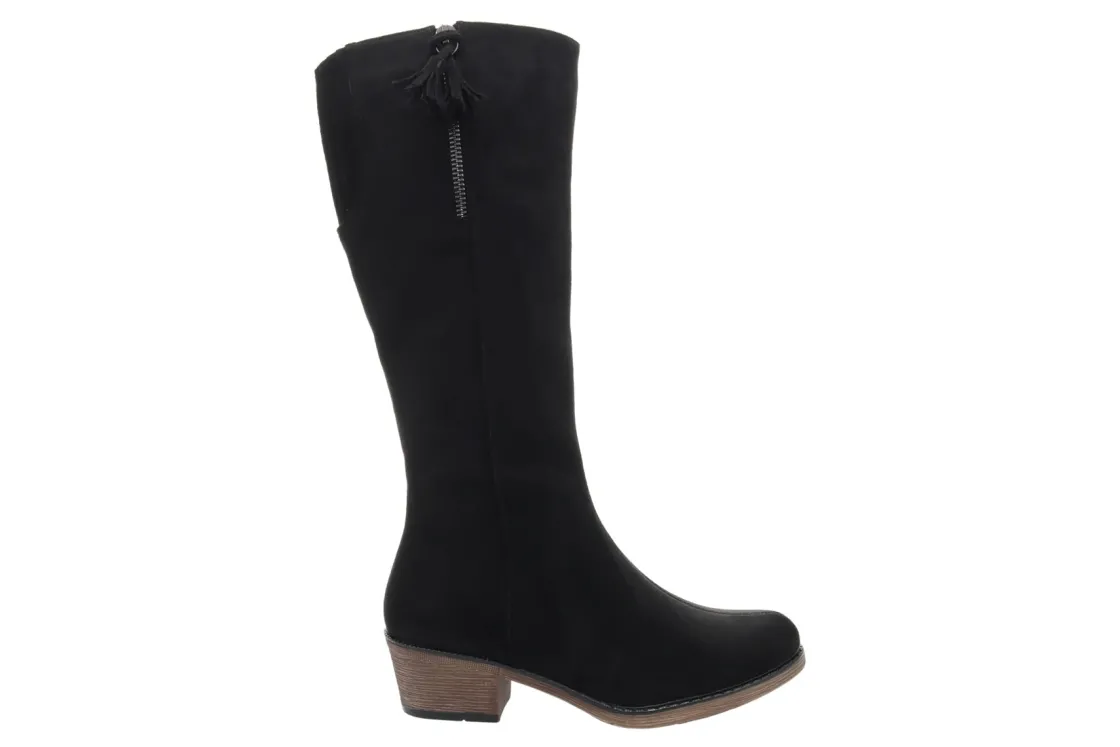 Tall shaft suede boot with inside zip and hidden goring plus decorative tassel.