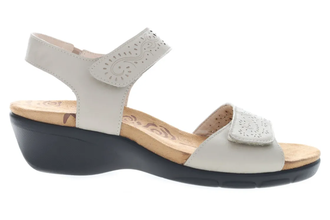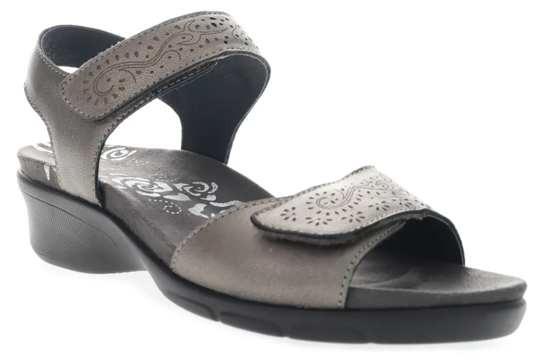 Leather two strap sandal with enchanting laser cut detailing and adjustability of hook and loop. Micro-fiber lined Open cell foam footbed. PU outsole absorbs shock to reduce fatigue with rubber tread inserts for traction.