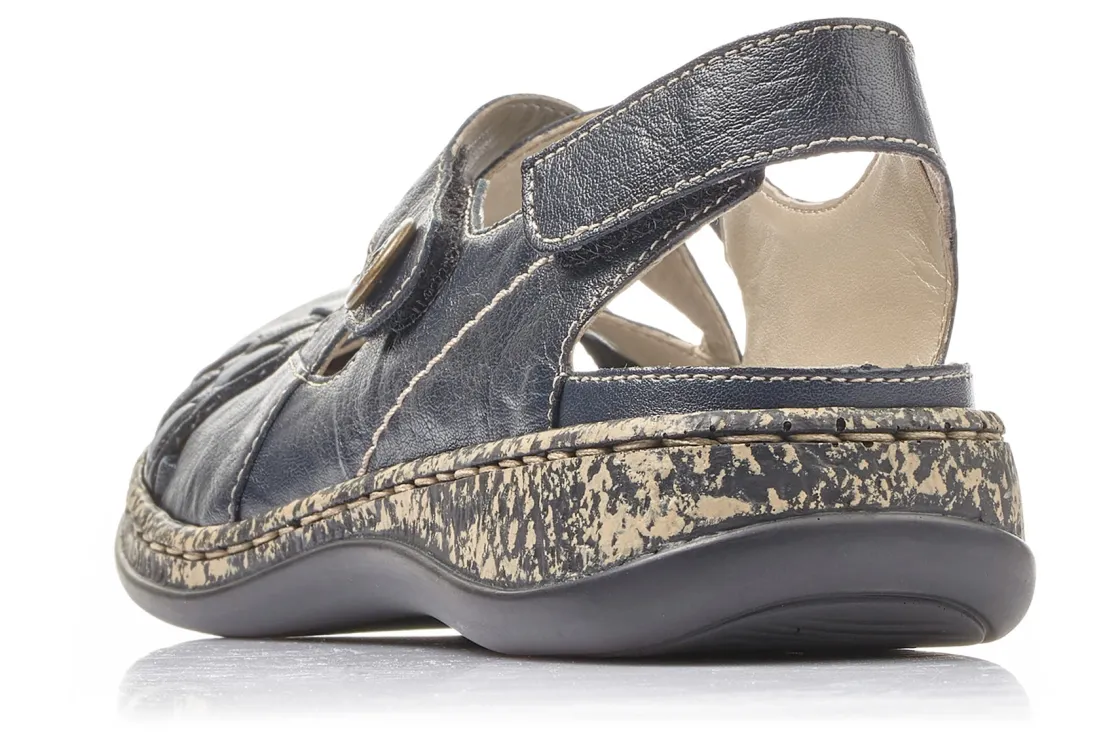 For ladies who are looking for comfort when choosing their shoes and do not want to miss out on a fashionable look, Rieker offers this beautiful women’s slip-on shoe in dark blue in its spring / summer collection. The leather upper has two openings in the toe area, decorated with a nice cross strap. The padded insole of the shoe is made of genuine leather. The crossed straps above the instep do not only look pretty, but are also fitted with a velcro closure respectively a small elastic band, so that an optimal fit is guaranteed. In the heel area is another velcro closure.