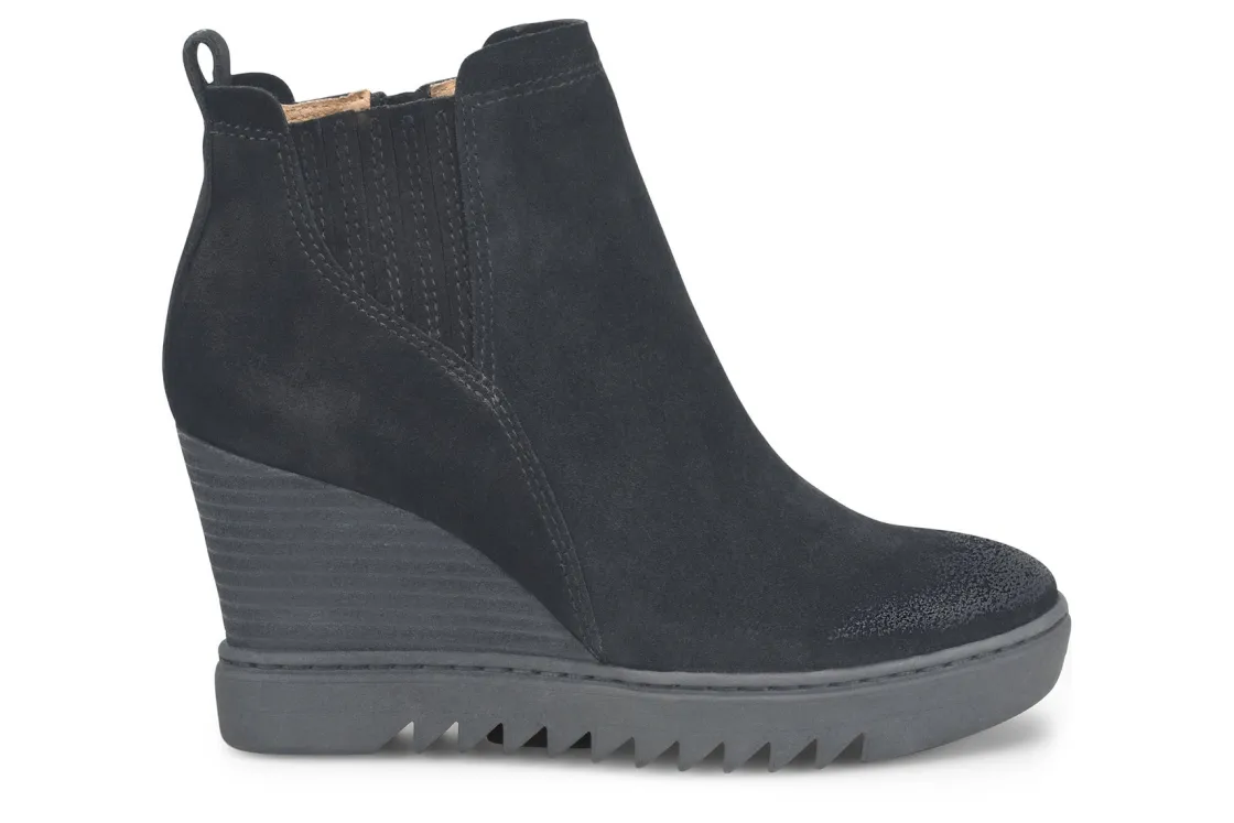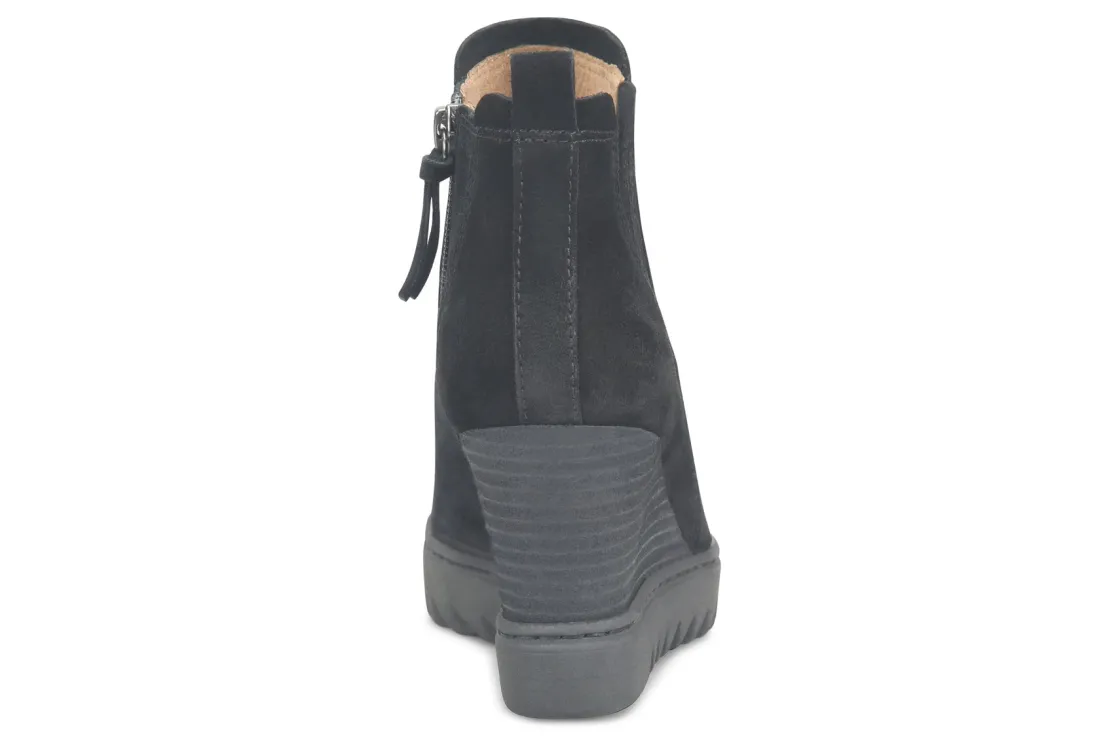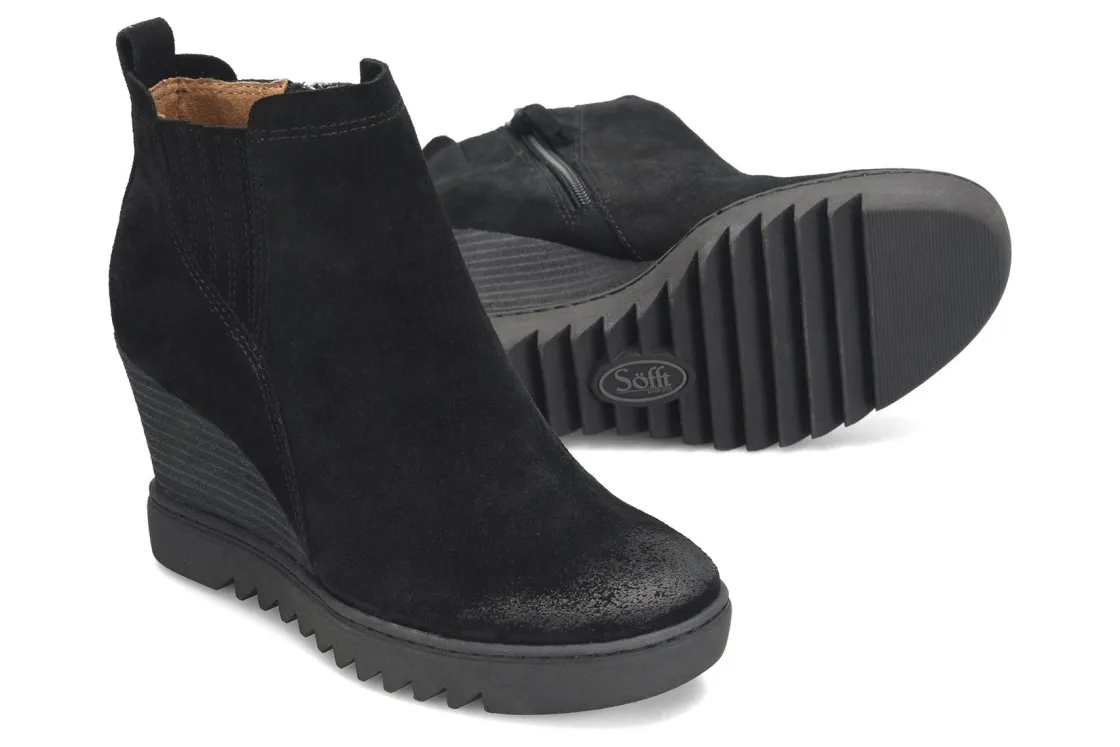 Sofft Utley is a durable and comfy women’s boot. These sturdy cold weather booties have waterproof suede uppers, an inside zipper and non-slip lugged TPR outsole. Other features include a microfiber lining, stretch goring, cushioned footbed and 3 ¼ inch stacked wedge heel height.