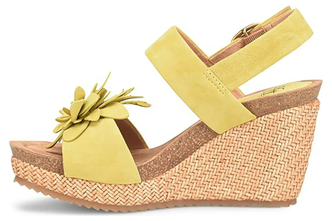 Sofft Cali is a chic sandal with tropical flair. Features include a suede upper, flower blossom ornament and wrapped basketweave PU wedge with TPR outsole. A cushioned cork footbed, adjustable buckle, leather lining and 3 ½ inch heel height elevates these trendy wedge sandals.