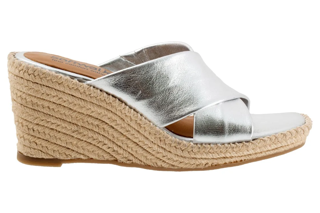 The Softwalk Hastings sandal has soft and supple leather bands that crisscross over with an artfully braided jute platform wedge.