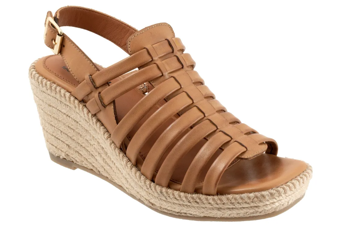 The Softwalk Havana wedge sandal has multiple thin leather bands and a back strap with an adjustable buckle. Hidden elastic goring provides a flexible fit and the artfully braided jute platform is set on a rubber sole.