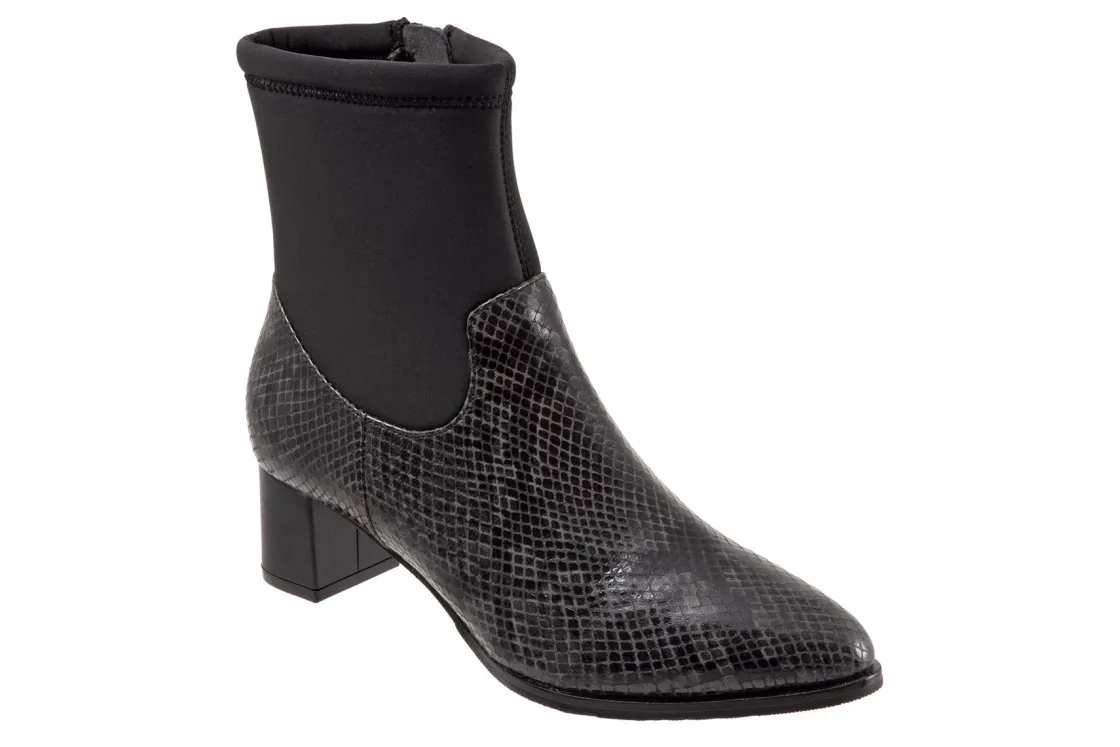 Trotters Kippy is a comfortable and upscale women’s boot. Prominent features include leather and fabric stretch uppers, zipper closure and rubberized outsole. A memory foam insole, soft velvet lining, stretch ankle shaft, 2-inch heel height and 5 ¾ inch shaft height outlines these unforgettable boots.