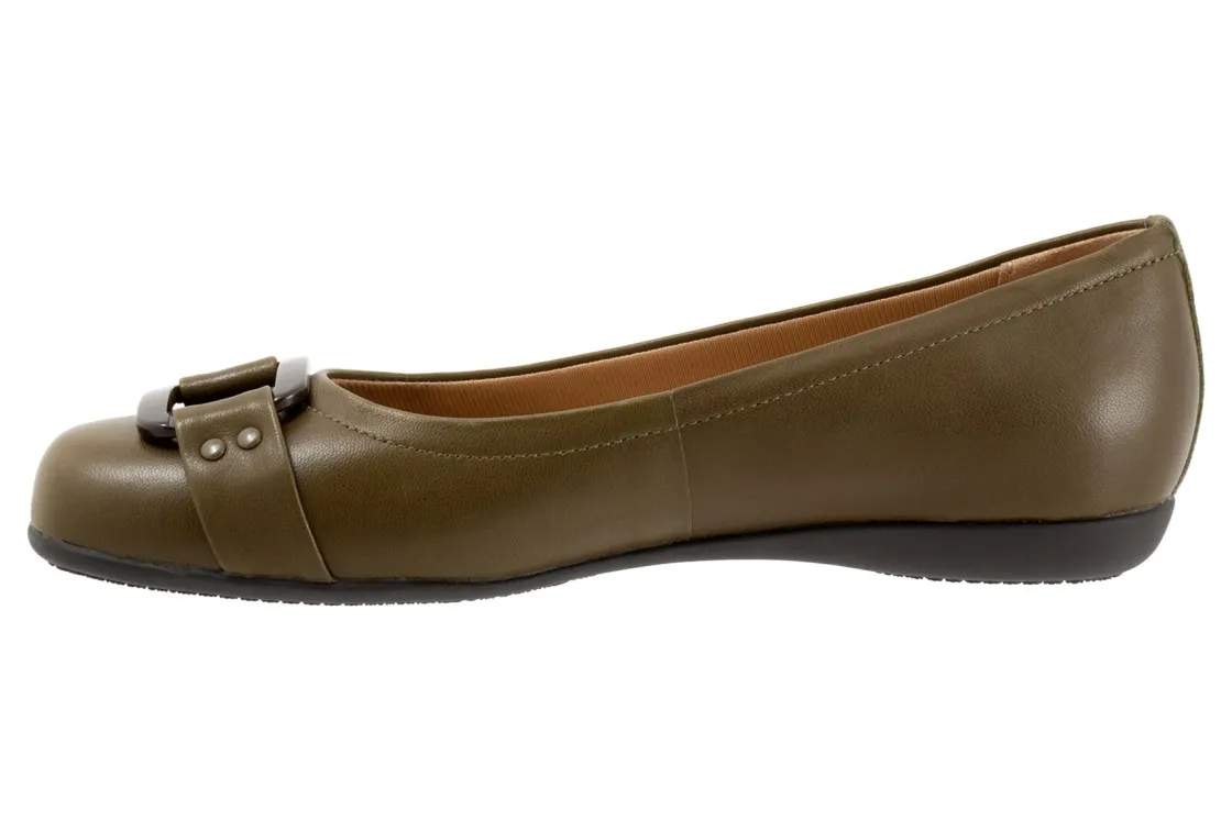 The ballerina flat, Sizzle, is dressed up with classy metal ornament buckle detail covering the toe. A great everyday walking tailored flat for work or play. Suede Metallic colors have a man-made microfiber suede upper with painted metal buckle detail on the toe.