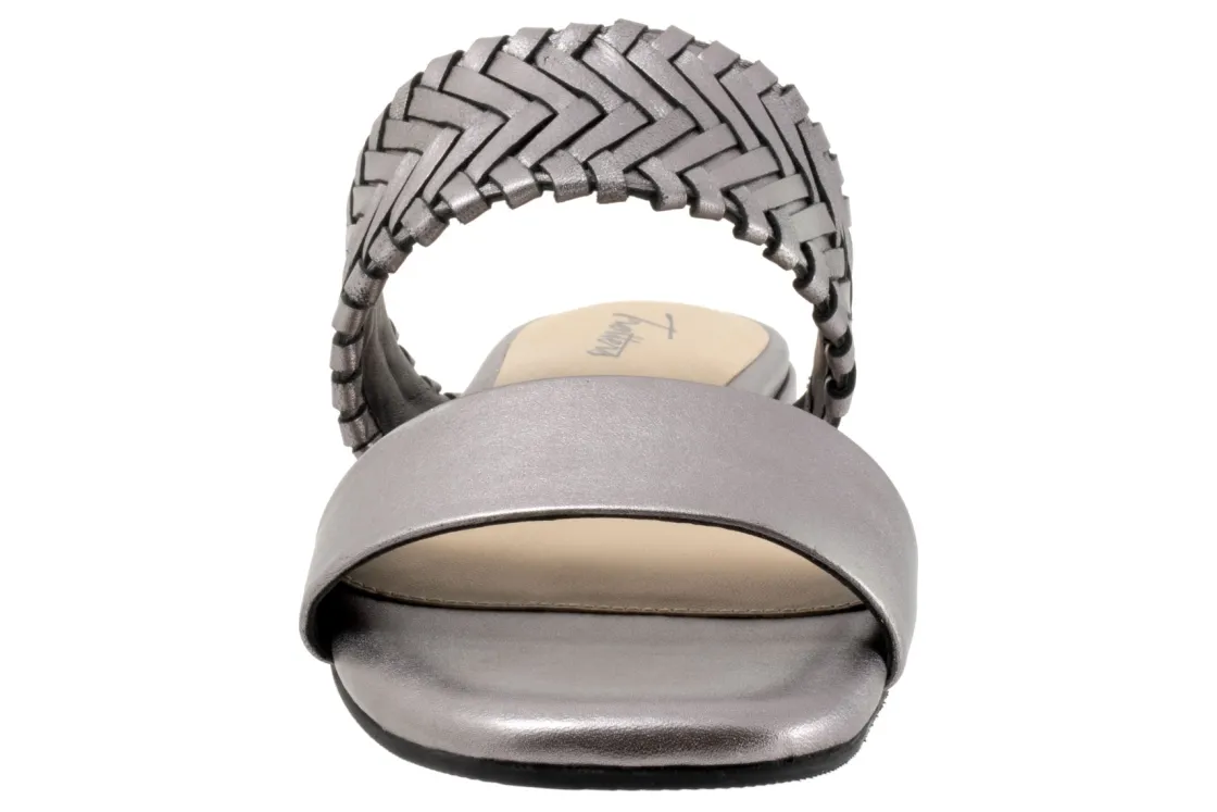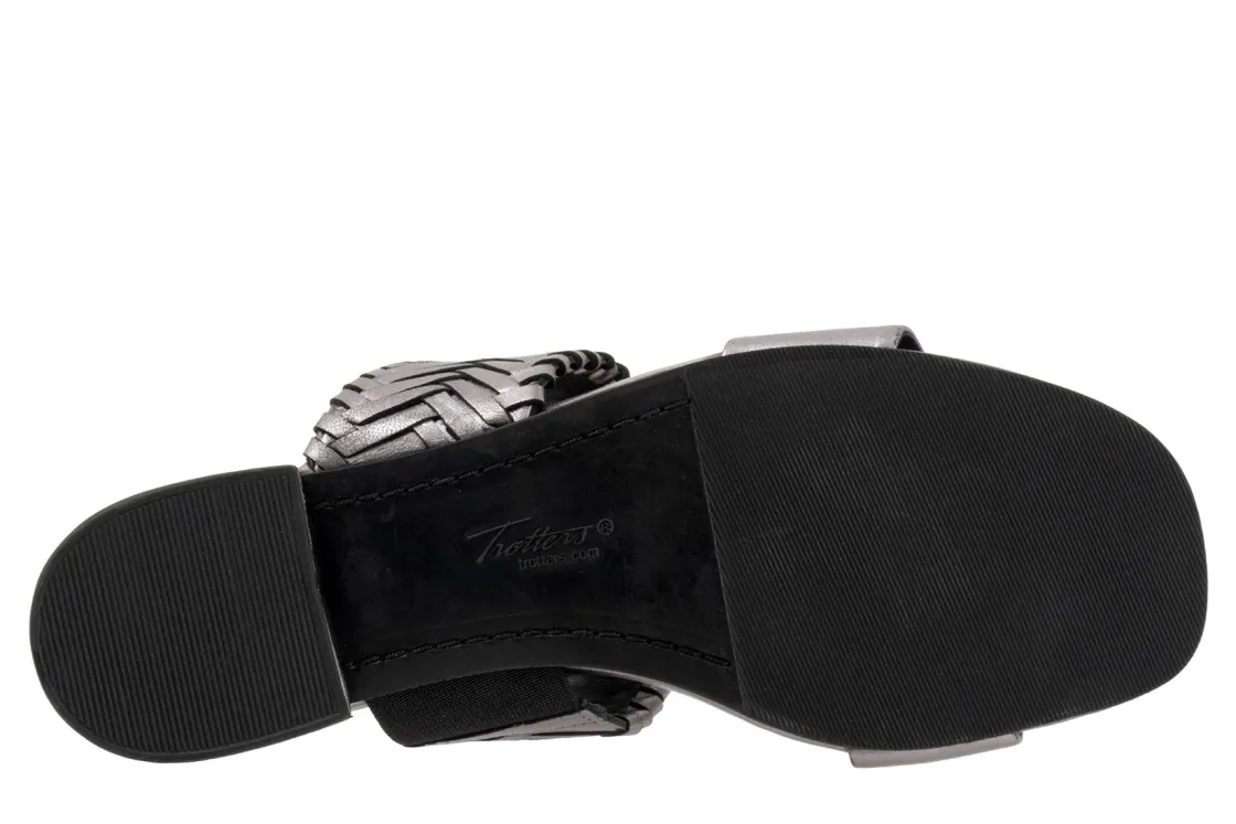 The Trotters Nalane sandal combines a smooth leather strap with a woven leather strap for a fun look. The woven strap has elastic goring on the instep and the lining is all leather for a super-comfortable sandal flat.