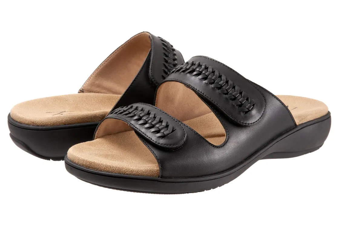 An easy slide on sandal with an adjustable velcro strap and a woven design.