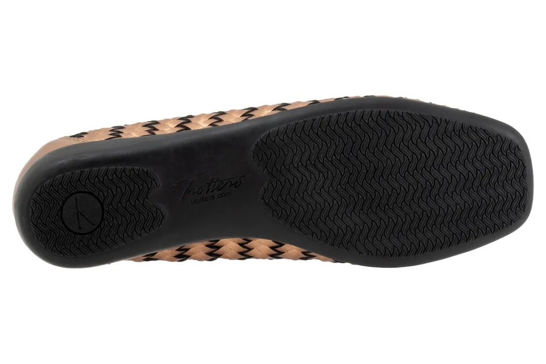 Trotters Gillian is a ballet flat with an intricate basket weave construction. Features include leather uppers, feminine bow detailing and rubberized outsole. A removable EVA footbed provides comfort, while a leather wrapped block heel adds stability.