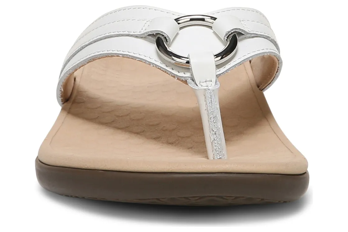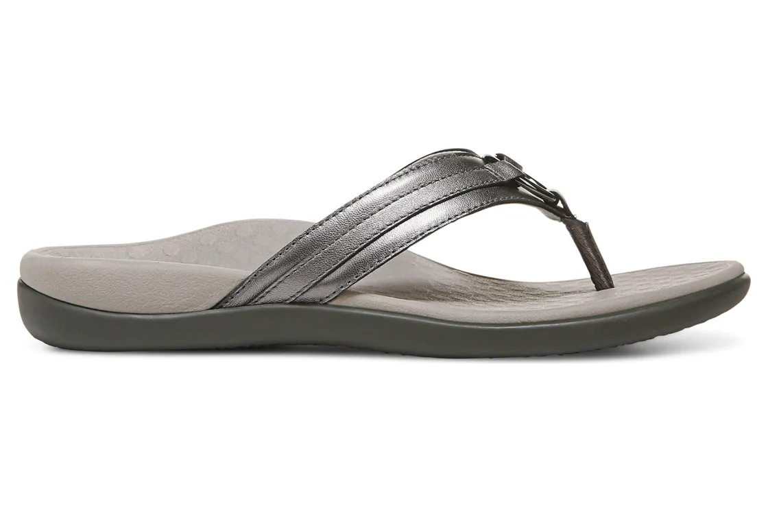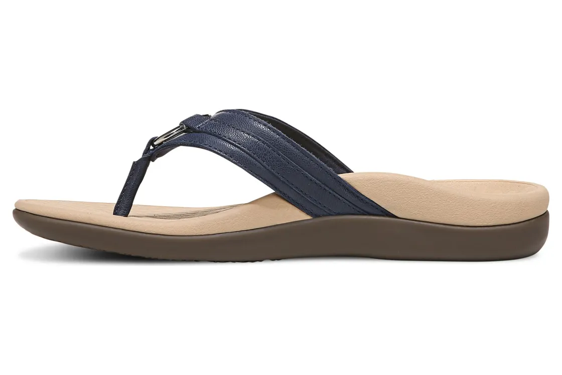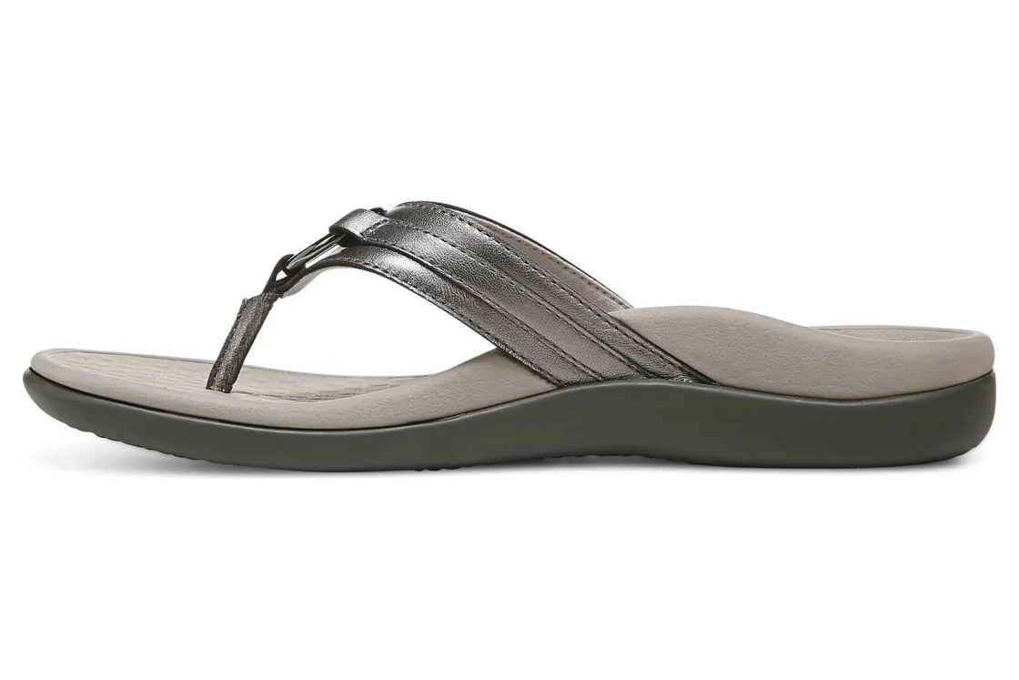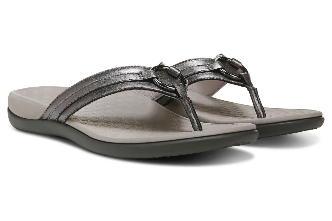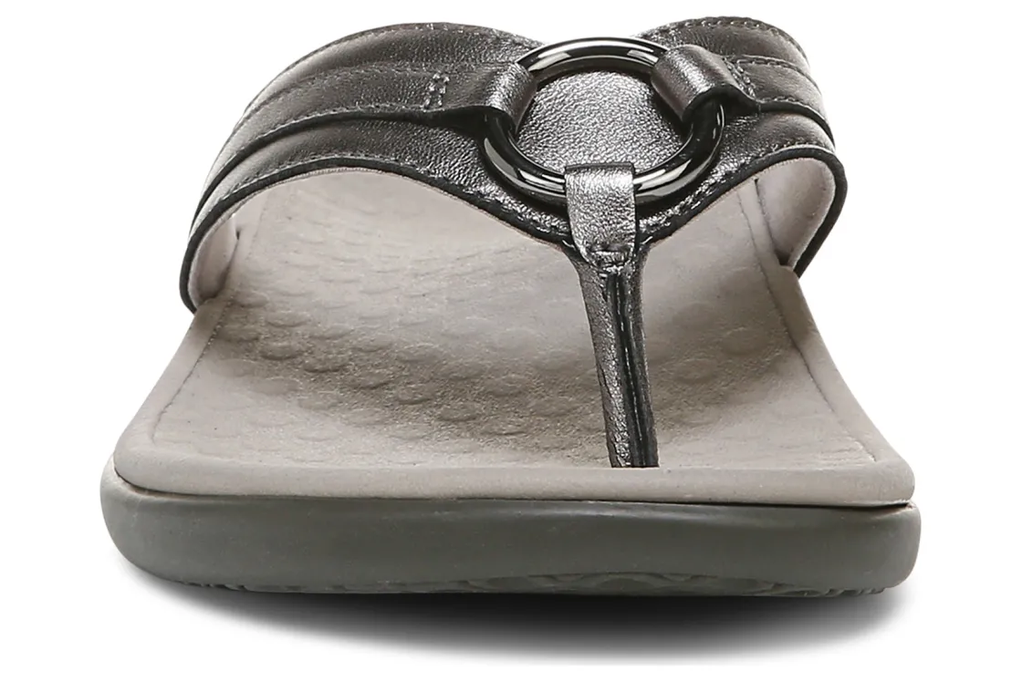 Vionic Aloe is a comfortable and dressy toe post sandal. These summer sandals have leather uppers, flexible EVA foam midsoles and durable rubber outsoles. A metallic-O-ring embellishment, foam-lined strap and ¾ inch heel height will make these sandals a warm weather favorite.A member of our Tide collection, Aloe helps to absorb shock and reduce stress on feet, ankles and knees. Vionic Technology assists in cushioning arches, helps to alleviate heel pain and plantar fasciitis and has received an APMA Seal of Acceptance.