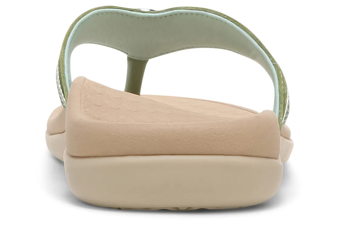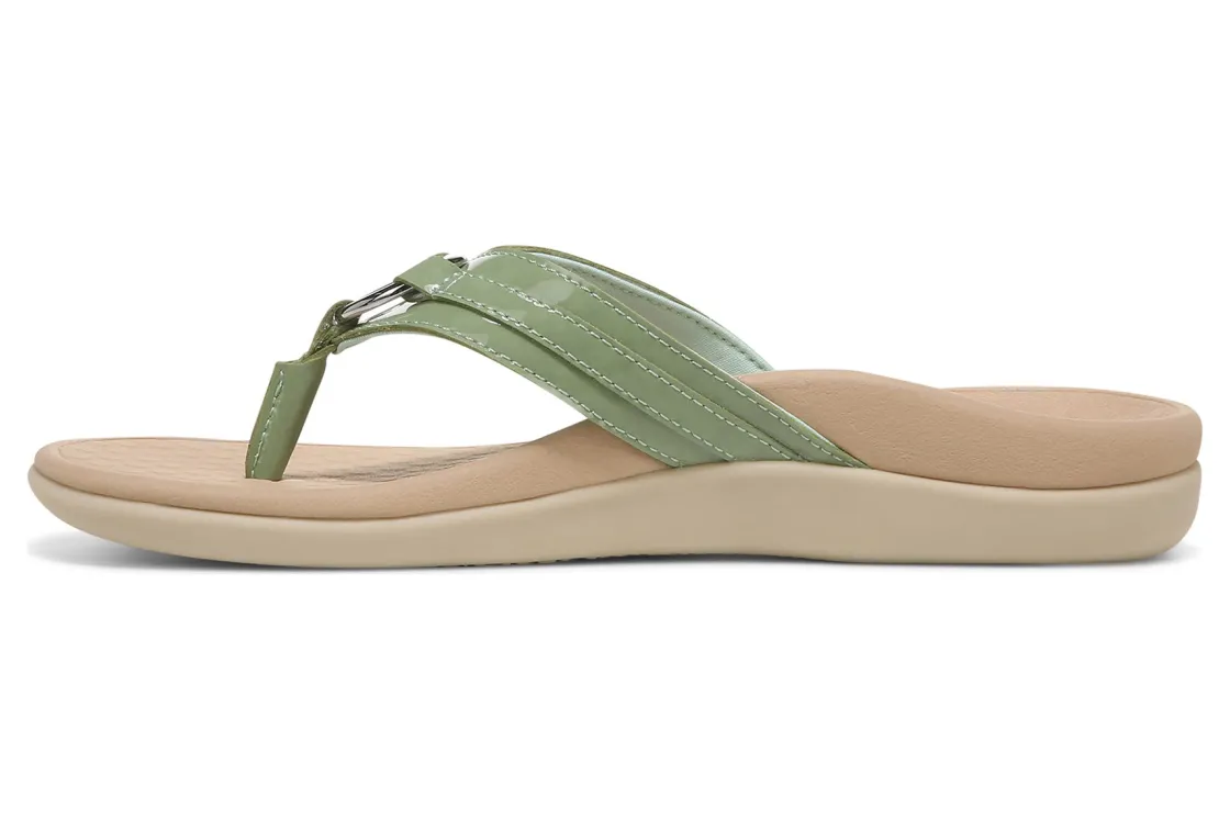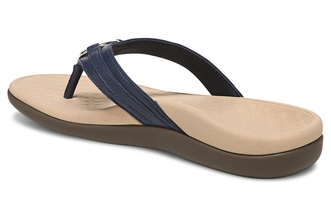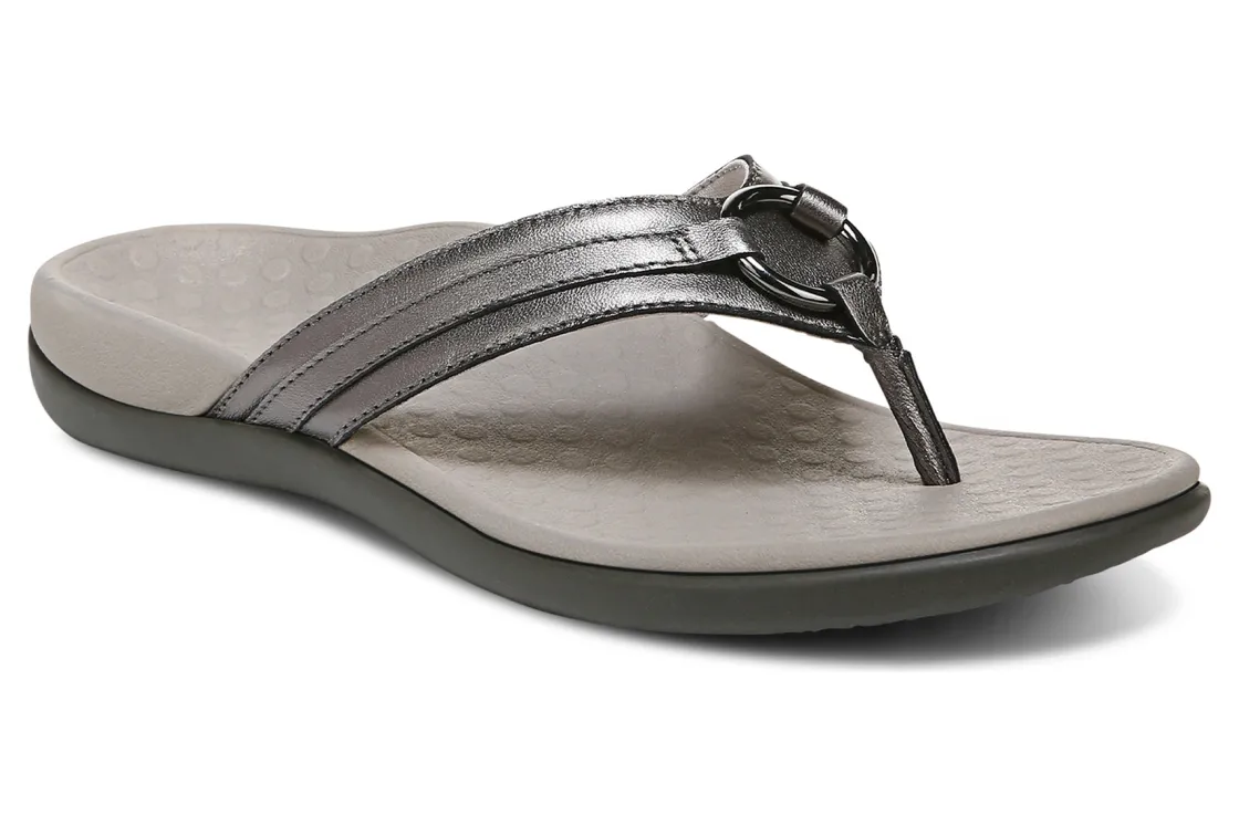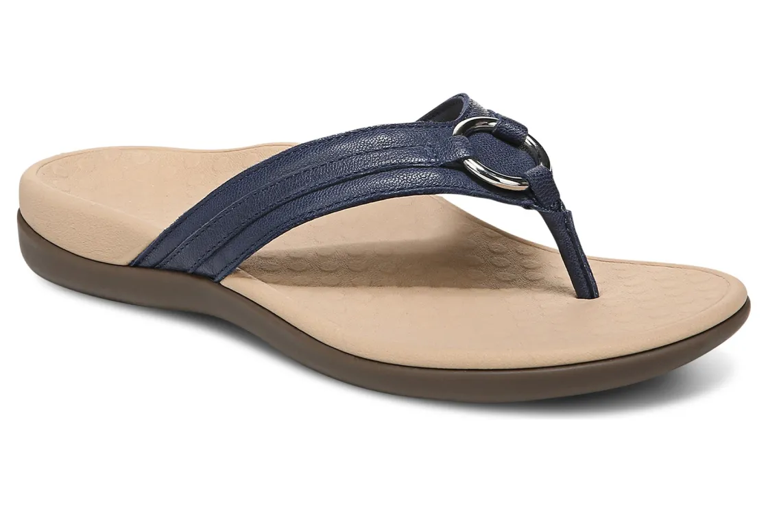 Vionic Aloe is a comfortable and dressy toe post sandal. These summer sandals have leather uppers, flexible EVA foam midsoles and durable rubber outsoles. A metallic-O-ring embellishment, foam-lined strap and ¾ inch heel height will make these sandals a warm weather favorite.A member of our Tide collection, Aloe helps to absorb shock and reduce stress on feet, ankles and knees. Vionic Technology assists in cushioning arches, helps to alleviate heel pain and plantar fasciitis and has received an APMA Seal of Acceptance.